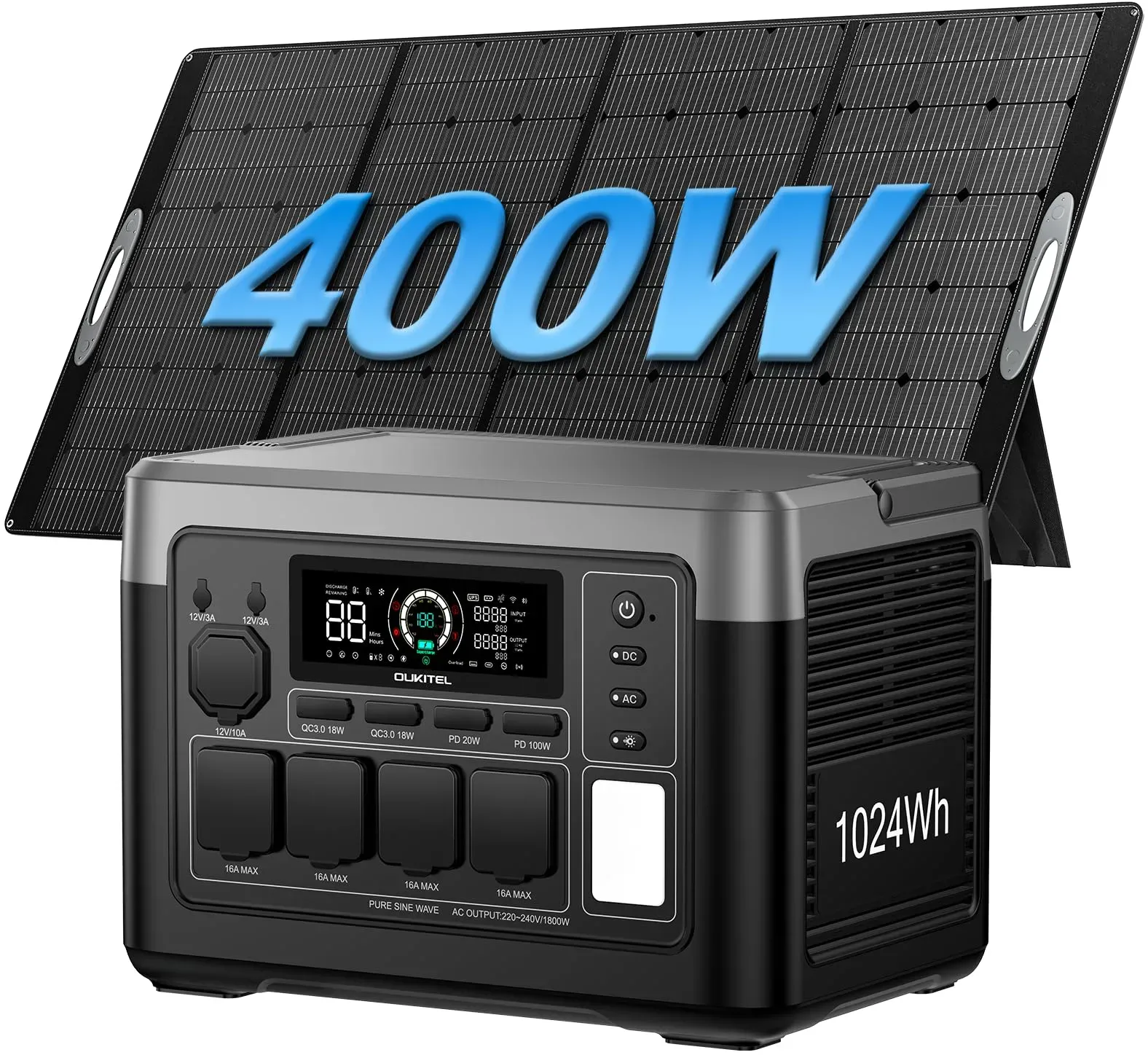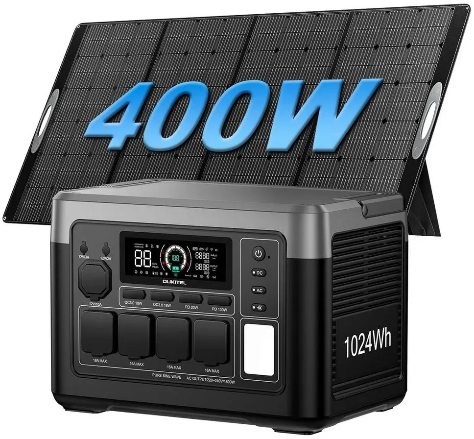 lieferbar-in 5-6 Werktagen bei dirOUKITEL Stromerzeuger P1000E Plus 1800W/1024Wh Tragbare Powerstation, 1,8 in kW, (LiFePO4-Akku, 1-tlg., Mit 400W Solarpanel), Solargenerator mit 4*1800W AC Ausgänge, für Camping,Wohnmobil,Notfall schwarz