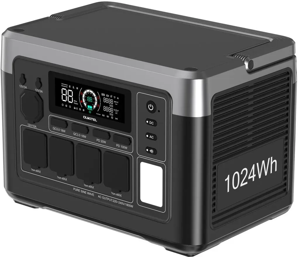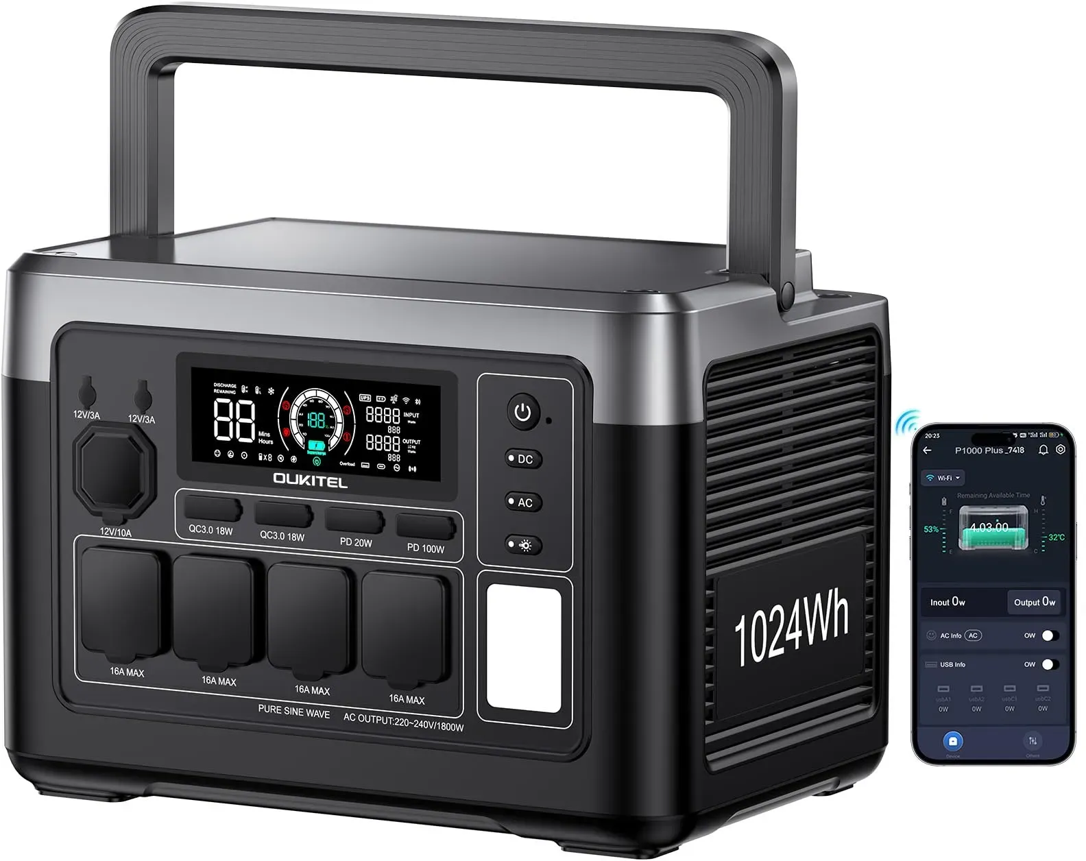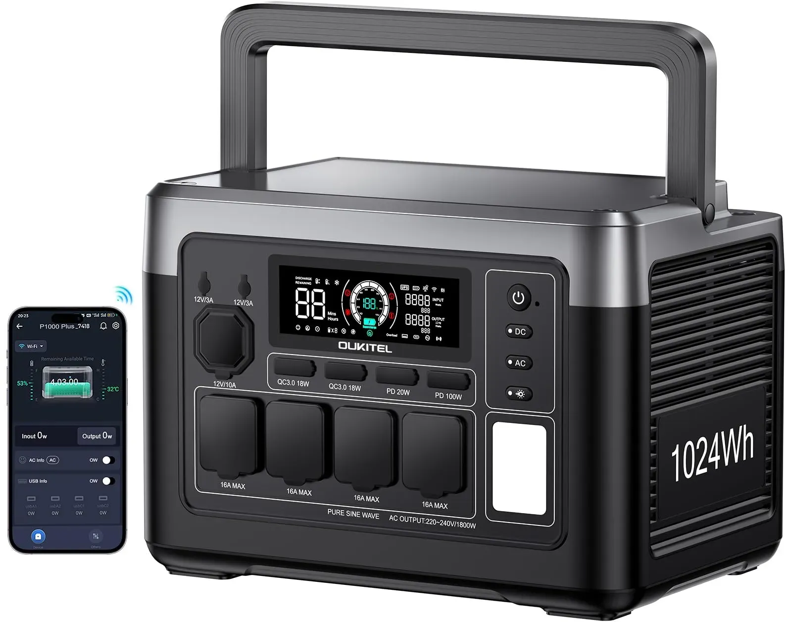 lieferbar-in 5-6 Werktagen bei dirOUKITEL Stromerzeuger P1000E Plus 1800W/1024Wh Tragbare Powerstation, 1,8 in kW, (LiFePO4-Akku, 1-tlg), Solargenerator mit 4*1800W AC Ausgänge, für Camping,Wohnmobil,Notfall schwarz