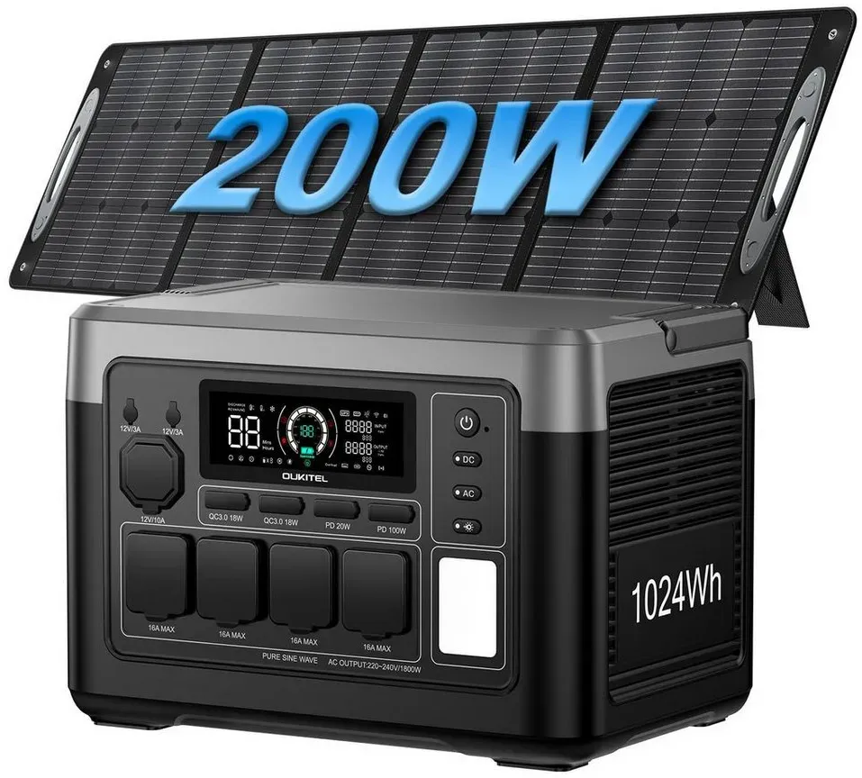 lieferbar-in 5-6 Werktagen bei dirOUKITEL Stromerzeuger P1000E Plus 1800W/1024Wh Tragbare Powerstation, 1,8 in kW, (LiFePO4-Akku, 1-tlg., Mit 200W Solarpanel), Solargenerator mit 4*1800W AC Ausgänge, für Camping,Wohnmobil,Notfall schwarz