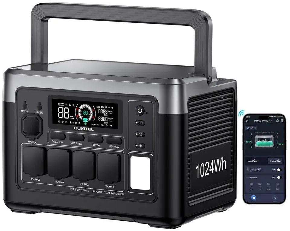 Kategorie: Stromspeicher - OUKITEL - GTIN:6941749811059 - 11 Anschlüsse alles in einem OUKITEL P1000E Plus 1024Wh Li-FePO4 Solargenerator mit 4 x 1800W (3600W Spitze) AC Ausgängen, PD100W TYPE-C*2 DC Ausgängen, USB-A 18W*2, 5521*2 ,12V Zigarettenanzünder*1, kann leicht mit allen Arten von Geräten mit hohem Stromverbrauch umgehen Zuverlässiger und Langlebiger LiFePO4 Akku Bis zu 4000+ Zyklen für den täglichen Gebrauch, mit einer Lebensdauer von bis zu 1 n. Ob für den Außen- oder Heimgebrauch, es kann leicht alle Arten von Geräten mit Strom versorgen, geeignet für Outdoor, Camping und Energiereserve LFP Kraftwerk 1200W Schnellladefunktion OUKITEL P1000E Plus verfügt über eine Schnellladefunktion, 1200W Schnellladung kann die Leistung zu 100% in 70 Minuten wiederherstellen, kombiniert mit AC und Solarladung, dauert es nur 40 Minuten, um vollständig geladen zu werden. Mit 500W Solarladung kann es in 2,1 Stunden vollständig auf 100% aufgeladen werden 10ms Nahtlose Leistungsumschaltung Im Falle eines Stromausfalls kann der OUKITEL P1000E Plus die angeschlossenen Geräte im UPS Modus in weniger als 10ms mit Strom versorgen und so den unterbrechungsfreien Betrieb kritischer Geräte wie CPAP Geräte im Falle eines Stromausfalls sicherstellen Intelligente APP Steuerung Reibungsloses Umschalten zwischen verschiedenen Lademodi durch die OUKITEL App, geräuscharmer Betrieb 29dB, Sie können die Ladegeschwindigkeit jederzeit flexibel anpassen und Echtzeit-Statistiken erhalten Packung OUKITEL ... ![]() ![]() OUKITEL P1000E Plus Tragbare Powerstation 1024Wh LiFePO4, Solargenerator mit 4*1800W (3600W Spitze) AC Ausgänge, 100W Typ-C, Schnellladung 0?80% in 40 Minuten, mit UPS, für Camping, Wohnmobil,Notfall
