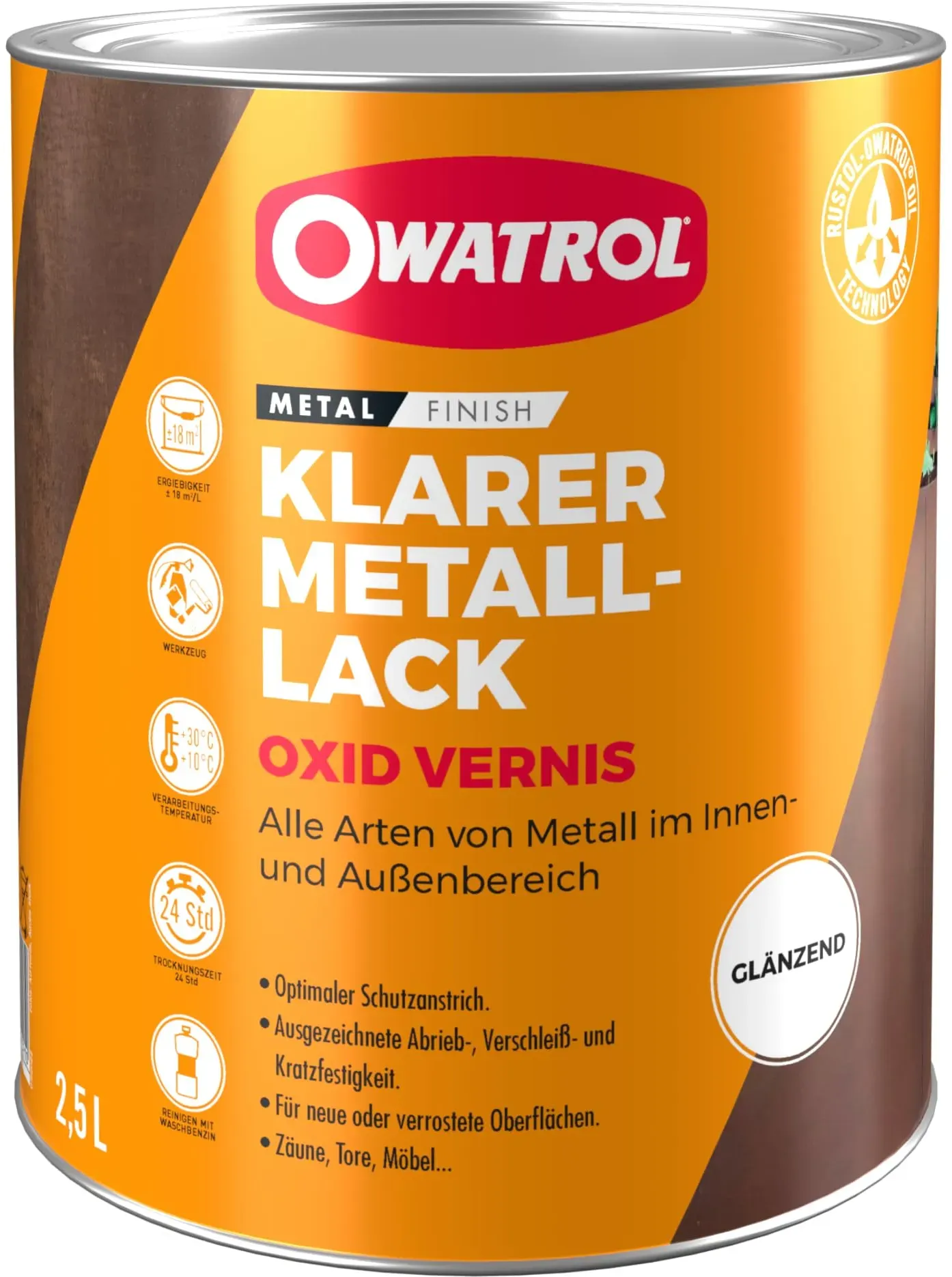 Kategorie: Farben & Lacke - Owatrol - GTIN:7823785237859 - Entrostet Konserviert Versiegelt - 24,95 Euro bei Amazon Marketplace Home Improvement - gefunden von billiger.de Dieser Klarlack bietet nicht nur Rostschutz, sondern auch eine ästhetische, matte Oberfläche für verschiedene Metalle. ![]() ![]() OWATROL® Oxid Vernis ? Einkomponenten-Klarlack ? farblos ? matt ? für innen ? Rostschutz Kfz ? Lack für Eisen und Nichteisen Metalle ? Wetterfest ? hohe UV-Beständigkeit