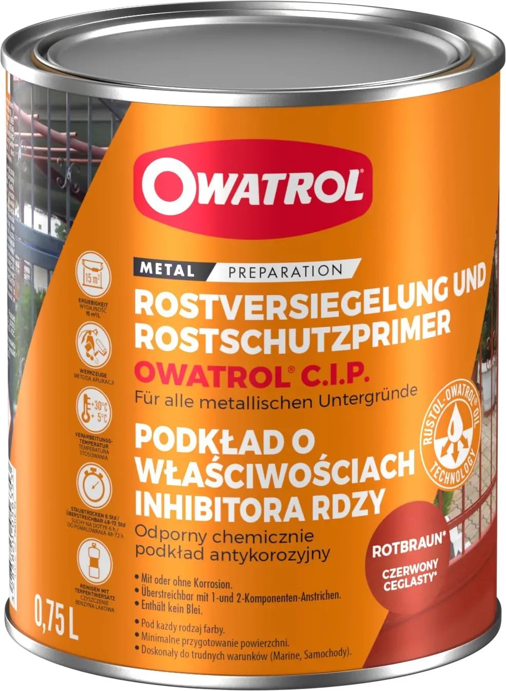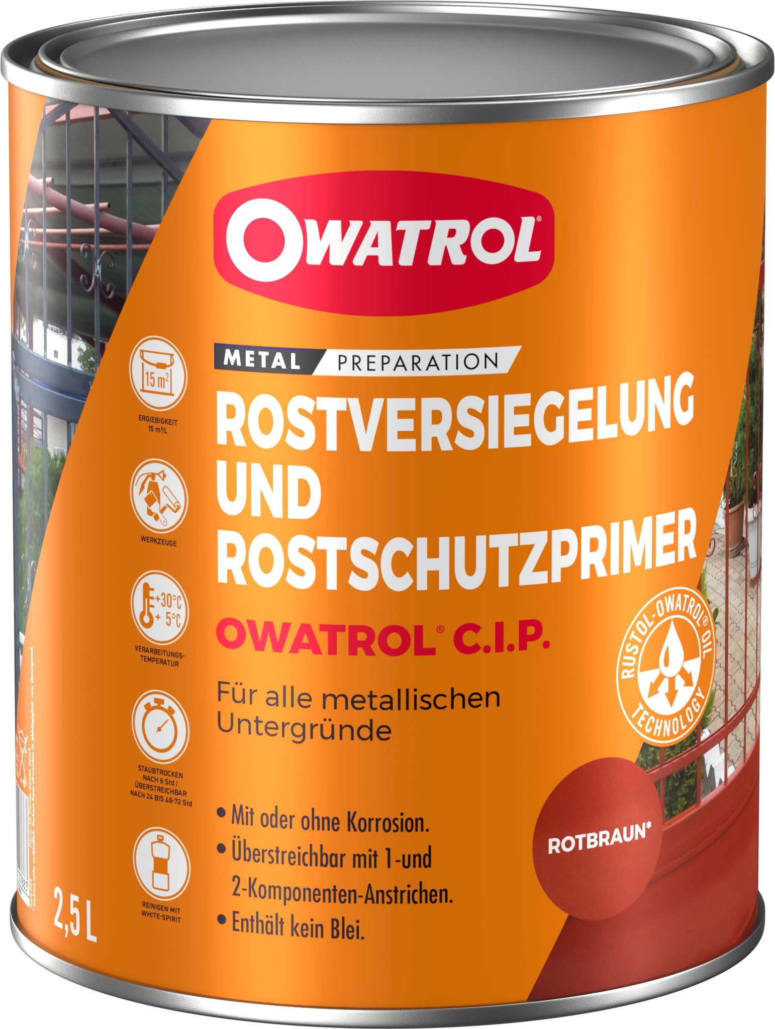 Kategorie: Farben & Lacke - Owatrol - GTIN:3297970015210 - OWATROL Oxid Vernis Einkomponenten-Klarlack farblos Für innen und außen Rostschutz Kfz Lack für Eisen und Nichteisen Metalle Wetterfest hohe UV-Beständigkeit (2,5 Liter, glänzend) - 81,95 Euro bei Amazon Marketplace Home Improvement - gefunden von billiger.de Die 2,5-Liter-Größe dieses Rostversiegelungs-Primers ist ideal für größere Projekte, bei denen eine umfassende Rostbehandlung notwendig ist. ![]() ![]() OWATROL Rustol C.I.P Rostversiegelung Rostschutz Primer (2,5)