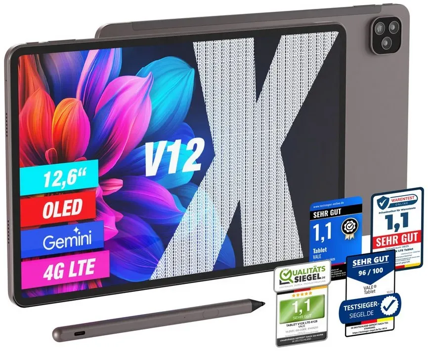 Verfügbarkeit: 7-13 Werktage - Kategorie: Tablet PCs - Ulefone - GTIN:6975326662642 - Das Tablet Armor Pad 3 Pro ist ein leistungsstarkes Gerät, das mit einem Mediatek MT8788 Prozessor ausgestattet ist und eine beeindruckende Leistung für verschiedene Anwendungen bietet. Mit einem grosszügigen Arbeitsspeicher von 8 GB und einer Speicherkapazität von 256 GB ist es ideal für Multitasking und die Speicherung umfangreicher Daten. Das 10,36 Zoll grosse AMOLED-Display sorgt für lebendige Farben und eine hervorragende Bildqualität, was es zu einer ausgezeichneten Wahl für Medienkonsum und kreative Arbeiten macht. Das Tablet läuft auf dem Android-Betriebssystem, das eine benutzerfreundliche Oberfläche und Zugang zu einer Vielzahl von Anwendungen bietet. Zudem unterstützt das Gerät LTE-Konnektivität, was eine schnelle Internetverbindung ermöglicht, egal wo Sie sich befinden. Die robuste Bauweise, die den MIL-STD-810 Standard erfüllt, sorgt dafür, dass das Tablet auch in anspruchsvollen Umgebungen zuverlässig funktioniert. - Mediatek MT8788 Prozessor für hohe Leistung - 8 GB RAM für reibungsloses Multitasking - 256 GB SSD-Speicher für umfangreiche Datenspeicherung - MIL-STD-810 zertifiziert für erhöhte Robustheit. - 419,00 Euro bei Galaxus.de - gefunden von billiger.de Das VALE Pad V12X LTE besticht durch sein edles Full-Metal Design, AMOLED Display und den leistungsstarken Prozessor, inklusive Stift und Hülle. ![]() ![]() VALE Pad V12X LTE mit 12,6" AMOLED Display & MediaTek G99 Prozessor Tablet (128 GB, 2G, 3G, 4G, (LTE), Edles Full-Metal Design, 16GB RAM, 128GB Speicher, inkl. Stift & Hülle)