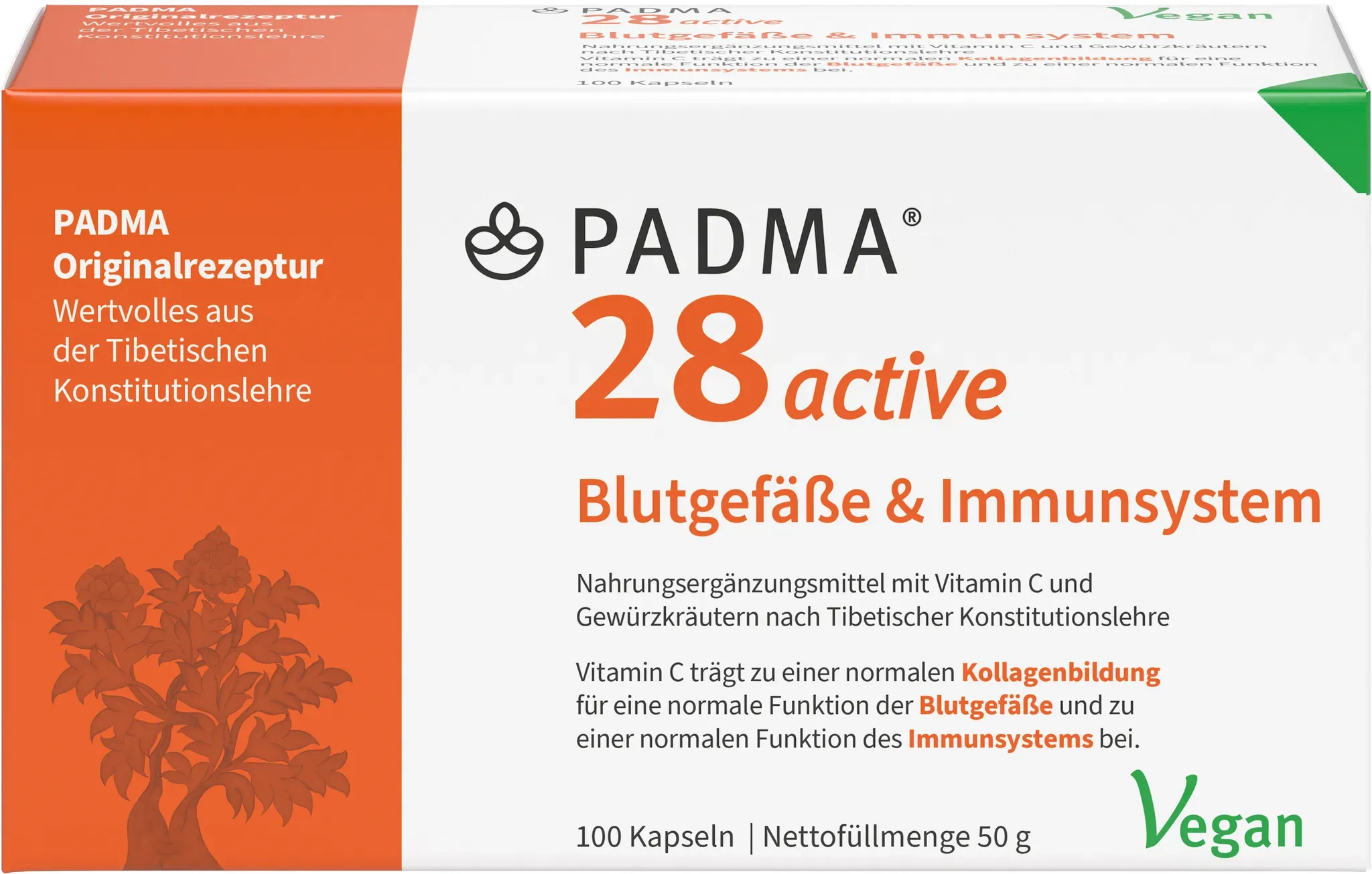 Auf Lager Versand durch AmazonPADMA 28 active 100 Kapseln - Mit Vitamin C - Unterstützung von Blutgefäßen, Immunsystem & Schutz vor Stress - Nach tibetischer Rezeptur mit Kräutern & Mineralien - Vegan, hergestellt in der Schweiz