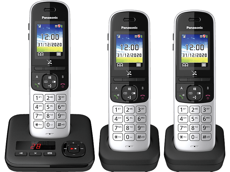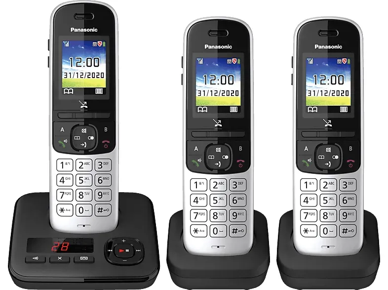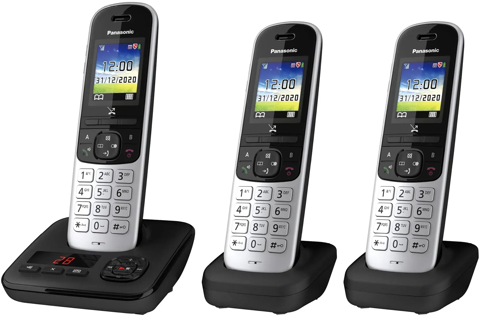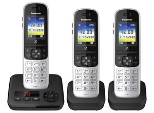 Auf Lager Versand durch AmazonPanasonic KX-TGH723GS Schnurlostelefon mit Anrufbeantworter 3er Set (DECT Telefon, strahlungsarm, Farbdisplay, Anrufsperre, Freisprechen) schwarz