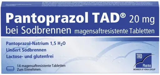 Zustand: Neu - 0,38 € / stück - Vitamine, Mineralien & Ergänzungsmittel - ratiopharm ratiopharm GmbH - 05520856 - EAN: 0609788908302 EAN: 4150055208565 - STARK GEGEN SODBRENNEN UND REFLUX: Der Rückfluss von Magensäure in die Speiseröhre (Reflux) kann unangenehm und schmerzhaft sein. Pantoprazol-ratiopharm SK 20 mg kann Linderung verschaffen. WIRKSTOFF PANTOPRAZOL: Pantoprazol-ratiopharm SK 20 mg enthält den Wirkstoff Pantoprazol, der die Bildung von Magensäure hemmt. Dadurch wird die Säuremenge im Magen reduziert. MITTEL GEGEN SODBRENNEN: Durch die Reduktion der Magensäure kann der Säureblocker Pantoprazol Reflux-Symptome wie Sodbrennen oder saures Aufstoßen verringern. WIRKEINTRITT: Bereits nach einem Behandlungstag können Ihre Symptome von Rückfluss und Sodbrennen gelindert werden. Es kann jedoch nötig sein, die Tabletten an 2 - 3 aufeinander folgenden Tagen einzunehmen. ANWENDUNG: Eine Tablette täglich immer zur gleichen Zeit vor einer Mahlzeit einnehmen - unzerkaut mit etwas Wasser schlucken. - 22 Händler im amazon.de Marketplace TAD Pharma PANTOPRAZOL TAD 20mg ist mit 5.99 Euro ein gutes Angebot für 14 Tabletten von einem bekannten Hersteller. ![]() ![]() TAD Pharma PANTOPRAZOL TAD 20mg bei Sodbrennen 14 St
