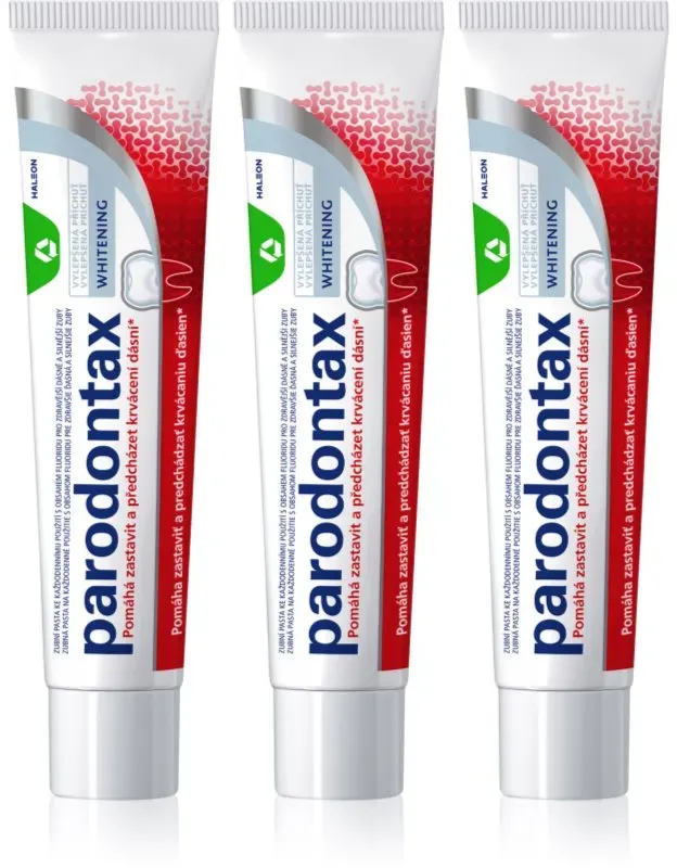 Verfügbarkeit: 1-2 Werktage - 3253,33 €/1L - Kategorie: Zahnpflegeartikel - Paradontax - GTIN:5054563949080 - Parodontax Whitening, 3x75 ml, Zahnpasta für Parodontose Unisex, Die Zahnpasta Parodontax Whitening ist zum sanften Weißen der Zähne bestimmt. Sie beseitigt unerwünschte Pigmente an den Zähnen und ihr regelmäßiger Gebrauch verhilft Ihnen zu einem strahlenden Lächeln. Eigenschaften: weißt die Zähne bekämpft Zahnbelag und Karies gegen Zahnfleischbluten stärkt den Zahnschmelz lindert Parodontose erfrischt den Atem Anwendung: Reinigen Sie die Zähne gründlich für mindestens 2 Minuten. Mindestens 2 x pro Tag verwenden. Für die perfekte Pflege der Zähne noch Zahnseide oder eine Interdentalbürste verwenden. - 9,76 Euro bei Notino - gefunden von billiger.de Die "Ultra Clean" Variante ist empfehlenswert für Nutzer, die eine besonders gründliche Reinigung wünschen. ![]() ![]() Parodontax PARADONTAX Ultra Clean 75 ml