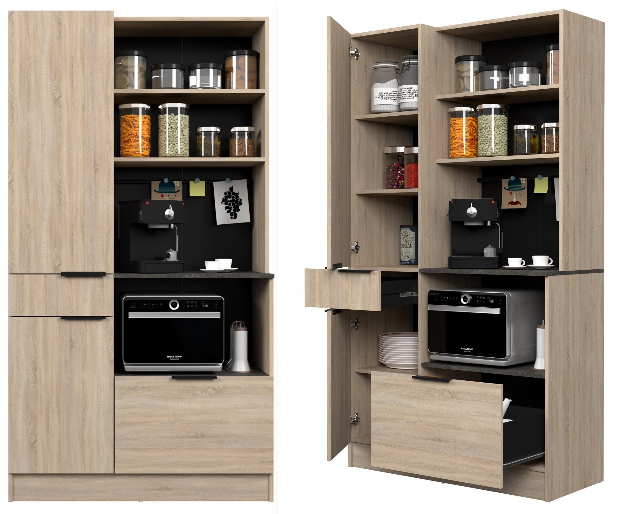 EAN: 3170720618063 - Küchenbuffet Fumay 11 Eichen Nachbildung-Beton Optik Material: Spanplatte foliert / Melamin beschichtetNachbildung:Korpus/Fronten: Eiche NachbildungAbsetzungen/Oberplatte: 151 - Beton Optik dunkelGriffe: Schwarz lackiert Alu Buffet 100 x 186 x 45 cmOben links: eine Türdahinter drei FächerOben rechts: drei offene Fächer - mit Kabeldurchlass in der Oberplatteunten links: ein Schubkastendarunter eine Türdahinter zwei Fächerunten rechts: ein offenes Fachdarunter ein Fach - darunter ein Küchenbuffet: Maße ca. 100 x 186 x 45 cm (BxHxT) oben links eine Türen, dahinter drei Fächer oben rechts drei offene Fächer mit Kabeldurchlaß in der Oberplatte unten links ein Schubkasten darunter eine Türen, dahinter zwei Fächer unten rechts ein offenes Fach, darunter ein großer Schubkasten Farbe und Material: Spanplatte foliert Farbe 151 - Eiche Nachbildung, Beton Optik dunkel Spanplatte foliert - Melamin beschichtet Farbe Griffe Schwarz lackiert Alu Ohne Dekoration und elektrische Geräte! Dieses schöne Küchenbuffet sorgt für extra Stauraum in jeder Küche. Die Optik fügt sich gut in bereits bestehende Küchenzeilen ein. Maße: B100 x H186 x T45 cm Lieferumfang: Küchenbuffet, Montagematerial und Montageanleitung (ohne Dekoration) - bei kaufland.de - aus Yadore Produktdaten Marktkauf. de