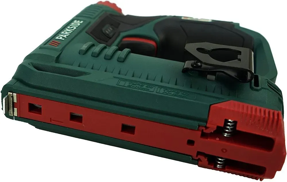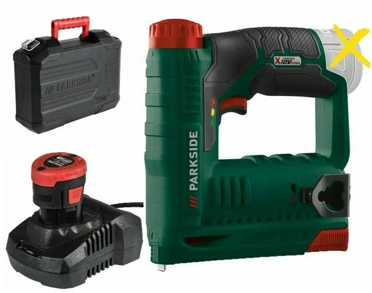 PARKSIDE - EAN: 04335754086618 - Schlanke Tackernase für schmale Bauteile und randnahes Arbeiten Komfortable Einhandbedienung mit rutschhemmender Softgrip-Ausstattung Drehknopf zur Schlagkraftvorwahl Magazin mit Füllstandsanzeige 3-stufige Akku-Statusanzeige am Gerät Fu r Klammern (Typ 53) 6 14 mm und Nägel (Typ 47) 14 15 mm Magazinkapazität: 100 Klammern oder 50 Nägel Kompatibel mit handelsüblichem Zubehör z. B. von Parkside, Bosch, etc. Im praktischen Aufbewahrungskoffer Kompatibel mit allen Akkus der Serie X 12 V Team Empfohlener Akku: 12 V (4 Ah) Akku und Ladegerät sind nicht im Lieferumfang enthalten Produktmerkmale Betriebsart: Akku Akkuspannung: 12 V Max. Schlagzahl: 140 min Enthaltenes Zubehör: 400 Klammern (10 mm), 100 Nägel (15 mm) Aufbewahrungskoffer: ja Material: Kunststoff Maße: ca. L185 x B 168 x H 50 mm Gewicht: ca. 970 g - bei lidl.de - aus Yadore Produktdaten Dieser elektrische Tacker ist eine vielseitige 2-in-1-Lösung, die sowohl als Hefter als auch als Nagelpistole verwendet werden kann und bereits Zubehör enthält. ![]() ![]() Parkside elektrische - Tacker Hefter eBay & Naglerpistole 2in1 + Ersatz Heftklammern & Nägel