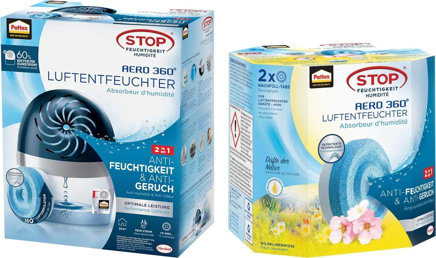 18.90 /1Stk - Kategorie: Luftentfeuchter - Pattex - GTIN:4057278000832 - Artikelbezeichnung Besondere Merkmale , 360 Luftzirkulation, bis 3 Monate, Anti-Geruch, Farbe & Material Farbe , Grau Blau, Maße & Gewicht Gewicht , 1100 kg, - 18,90 Euro bei OTTO - gefunden von billiger.de Dieses Bundle aus Gerät und Nachfüll-Tabs mit Frischer Wasserfall und Wildblumenwiese bietet eine vielseitige Lösung für unterschiedliche Duftpräferenzen. ![]() ![]() Bundle aus Pattex Luftentfeuchter Aero 360 Gerät & Nachfüll-Tab, Frischer Wasserfall, 450g und Pattex Luftentfeuchter Aero 360 Nachfüll-Tabs, Wildblumenwiese, 2 x 450g
