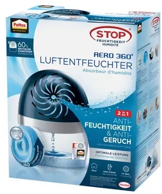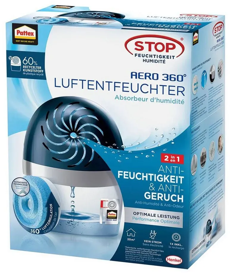 Zustand: Neu - Luftentfeuchter - Pattex Henkel - 2160520 - EAN: 4057278000832 - Feuchtigkeits- und Geruchskontrolle - Der AERO 360° Entfeuchter ist die einfache Lösung, um überschüssige Feuchtigkeit effektiv zu absorbieren und schlechte Gerüche zu neutralisieren. Optimale Leistung - Das aerodynamische Design fördert eine effiziente 360°-Luftzirkulation. Die Lufttrockner Tabs bestehen aus absorbierenden Kristallen mit patentierten Anti-Geruchs-Mitteln. Sicher und leise - Das 360° Entfeuchtungsgerät AERO funktioniert ohne Strom und bietet dank seines Auslaufschutzsystems maximale Sicherheit. Die AERO 360°-Nachfüll-Packs halten bis zu 3 Monate*. Nachhaltiges Material - Das Gerät zur Luftentfeuchtung besteht zu 60% aus recyceltem Kunststoff und ist einfach zu bedienen. Die Füllstandsanzeige zeigt an, wann der Tab ersetzt werden muss. Praktischer Lieferumfang - Pattex AERO 360º Luftentfeuchter, nachfüllbares Luftentfeuchtungsgerät zur Vermeidung von feuchtigkeitsbedingten Problemen & Gerüchen, 1 Gerät inkl. 1 Nachfülltab 450g - bei Amazon.de Dieses Angebot für das Gerät mit Granulat in Blau ist eine preiswerte und funktionale Option für die Grundausstattung. ![]() ![]() Pattex Luftentfeuchter Aero 360 Gerät und Granulat 1x450gr - blau
