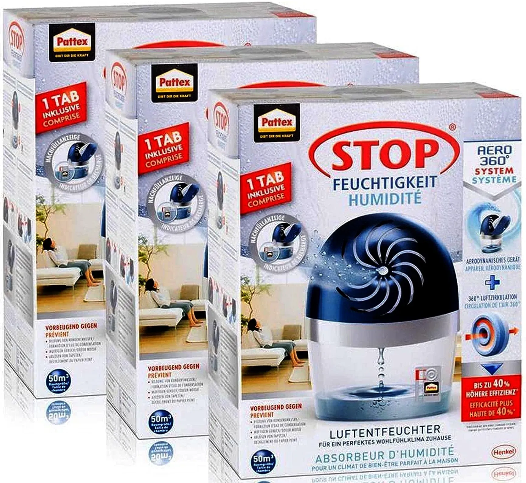 Zustand: Neu - Luftentfeuchter - Pattex - - EAN: 4057278002409 - - Verkäufer: Baumarkt + Fachgrosshandel alle Preise inkl. MwSt. im amazon.de Marketplace Das 3er-Pack des Systems ist eine kostengünstige Option für größere Haushalte oder mehrere Räume, die gleichzeitig entfeuchtet werden sollen. ![]() ![]() Henkel Pattex Stop Feuchtigkeit Aero 360 System Luftentfeuchter (3er Pack)