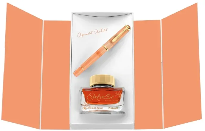 Kategorie: Babyphone - Pelikan - GTIN:4012700827944 - Tintenfass Apricot Achat und M200 Classic Füllfederhalter in Apricot Achat M im Set von Pelikan - Special Edition Der Edelstein Apricot Achat ruft Wärme, Kreativität und Freude hervor. Seit Langem wird dieser zarte Stein für seine aufmunternde Ausstrahlung geschätzt und häufig mit Optimismus und einer beruhigenden Energie in Verbindung gebracht, die dem Alltag eine sanfte Harmonie verleiht. Der strahlende Apricot Farbton des M200 Apricot Achat von Pelikan spiegelt diese Eigenschaften mit subtiler Raffinesse wider. Weich, warm und leicht durchscheinend, schimmert das Harz zart und fängt das Licht ein wie Sonnenstrahlen, die an einem Sommernachmittag durch Obst scheinen. Das samtmatte, transparente Finish erlaubt einen Blick in das Innere des Füllhalters und zeigt elegant den klassischen Kolbenmechanismus von Pelikan. In Kombination mit der Edelstein Tinte des Jahres 2025, Apricot Achat, entsteht ein harmonisches Schreiberlebnis voller Wärme und Charakter. Die fein gearbeitete Edelstahlfeder und die dekorativen Elemente sind mit 24 karätigem Gold plattiert und ergänzen die sanften Apricot Töne perfekt. Die Edelstein Ink hat eine einzigartige Rezeptur, die für ein besonders weiches Schreibgefühl sorgt und gleichzeitig das Innere des Füllhalters pflegt. Die brillanten Farben entsprechen den Farbgebungen weltweit berühmter Edelsteine. Ein Flakon Edelstein Ink Tinte enthält 50ml. Bitte beachten Sie, dass der Füllhalter bei ... ![]() ![]() Pelikan Classic - M200 Old eBay Style Schreibset Füller Kugelschreiber Schildpatt 1997