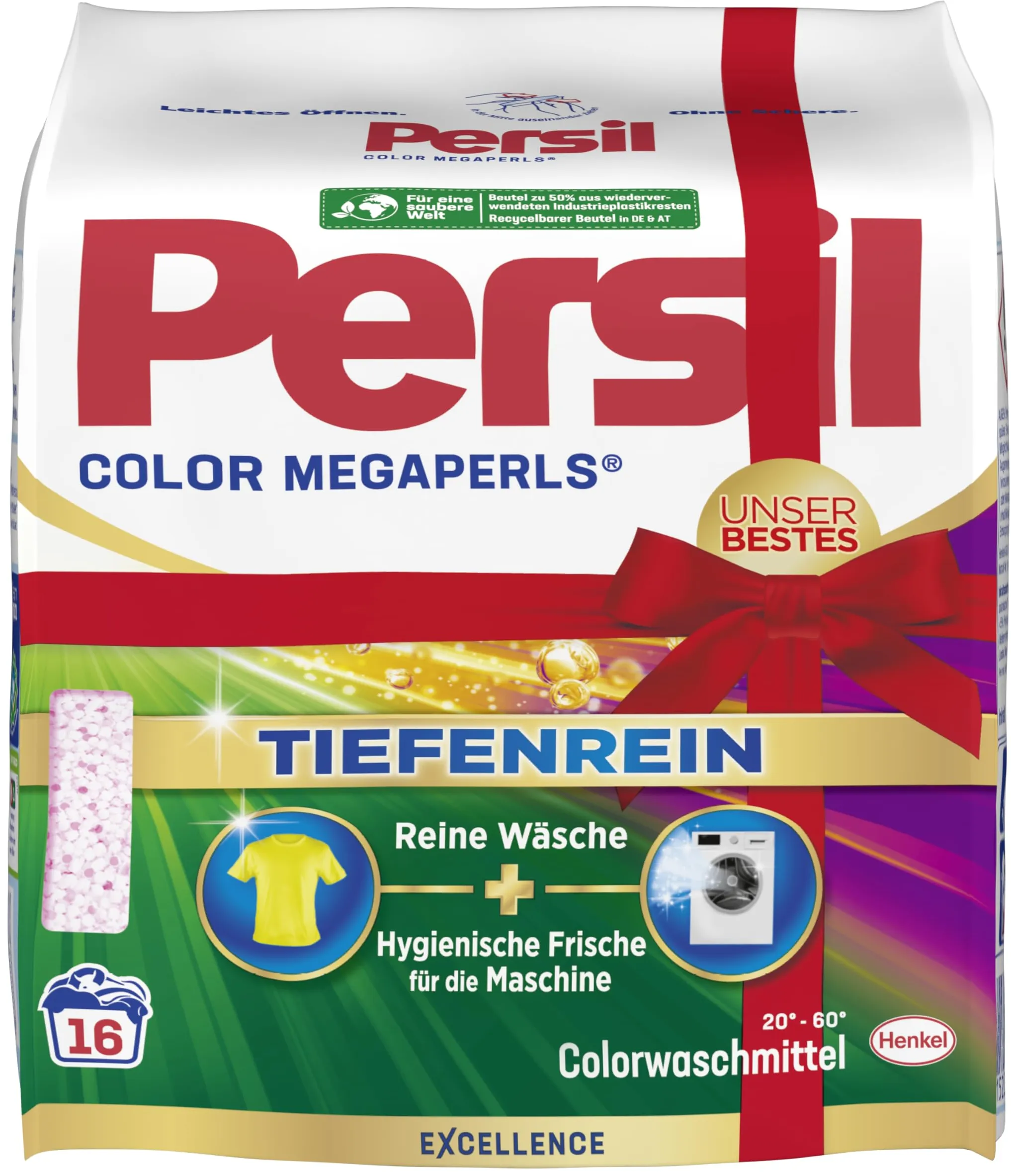 0,39 / 1,0 Wl - Kategorie: Waschmittel - Persil - GTIN:4015200034997 - Das Megaperls Color Excellence Colorwaschmittel von PERSIL bietet eine effektive Reinigung, die bereits bei niedrigen Temperaturen von 20 C wirksam ist, dank seiner innovativen Formel. Mit dieser neuartigen Formel sorgt das Waschpulver nicht nur für hygienisch reine Wäsche, sondern verleiht der Maschine auch eine frische Note. Für eine kraftvolle Fleckentfernung dringt das Waschmittel tief in die Fasern ein und entfernt selbst hartnäckigste Flecken mühelos. Zudem hält es dunkle Kleidung und Buntwäsche auch nach häufigem Waschen strahlend rein. Ein unverzichtbares Produkt für alle, die Wert auf saubere und gepflegte Wäsche legen. - 8,95 Euro bei dm.de - gefunden von billiger.de ![]() ![]() Persil Sensitive Megaperls Tiefenrein (16 Waschladungen), Waschmittel für Allergiker mit beruhigender Aloe vera für sensible Haut, effektiv von 20 °C bis 95 °C, ECARF-zertifiziert
