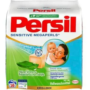 0,39 / 1,0 Wl - Kategorie: Waschmittel - Persil - GTIN:4015200034997 - Das Megaperls Color Excellence Colorwaschmittel von PERSIL bietet eine effektive Reinigung, die bereits bei niedrigen Temperaturen von 20 C wirksam ist, dank seiner innovativen Formel. Mit dieser neuartigen Formel sorgt das Waschpulver nicht nur für hygienisch reine Wäsche, sondern verleiht der Maschine auch eine frische Note. Für eine kraftvolle Fleckentfernung dringt das Waschmittel tief in die Fasern ein und entfernt selbst hartnäckigste Flecken mühelos. Zudem hält es dunkle Kleidung und Buntwäsche auch nach häufigem Waschen strahlend rein. Ein unverzichtbares Produkt für alle, die Wert auf saubere und gepflegte Wäsche legen. - 8,95 Euro bei dm.de - gefunden von billiger.de Dieses Sensitive Megaperls-Angebot ist mit 9,13 Euro für 16 Waschladungen ein sehr günstiges Angebot für Allergiker. ![]() ![]() Persil Sensitive Megaperls Tiefenrein (16 Waschladungen), Waschmittel für Allergiker mit beruhigender Aloe vera für sensible Haut, effektiv von 20 °C bis 95 °C, ECARF-zertifiziert