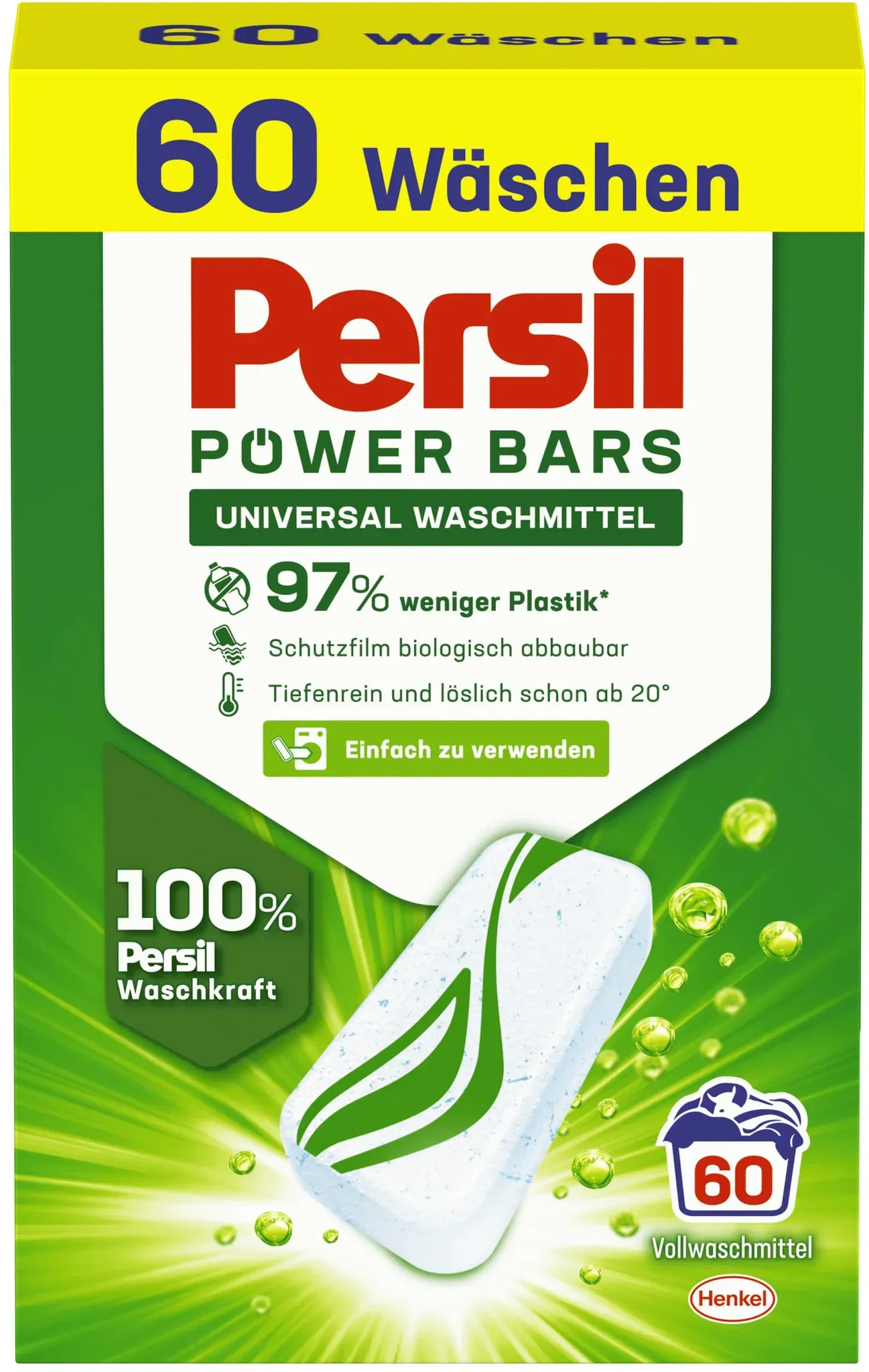 Zustand: Neu - 13,55 € / kg - Weiß- & Vollwäsche - Persil Henkel KG aA - P60BU - EAN: 4015200030500 EAN: 4015100352573 - Kraftvoll - Die Persil Power Bars sorgen dank 100 % Persil Waschkraft für strahlende Reinheit und sind bereits ab 20° C löslich Nachhaltig - Die Verpackung der Waschmittel Bars enthält 97 % weniger Plastik** bei 100 % Persil Waschkraft* und kann im Altpapier recycelt werden Einfach zu verwenden - Der kleine Power Bar ist praktisch in der Handhabung, bereits vordosiert und durch eine kompakte Verpackung besonders platzsparend zu lagern Für eine saubere Welt - Persil Waschriegel sind nicht nur plastiksparend**, sondern verursachen aufgrund ihrer kompakten Verpackung zudem weniger CO‚‚ Transportemissionen*** Biologisch abbaubarer Schutzfilm - Die Schutzfolie der Waschpulver Bars ist wasserlöslich & vollständig biologisch abbaubar: Sie muss vor dem Waschen nicht entfernt werden - Verkäufer: Familienunternehmen J&J Warenhandel im amazon.de Marketplace ![]() ![]() Persil Power Bars Universal Waschmittel (60 Waschladungen), vordosiertes Vollwaschmittel in nachhaltiger Verpackung, für hygienisch reine Wäsche bereits ab 20 C