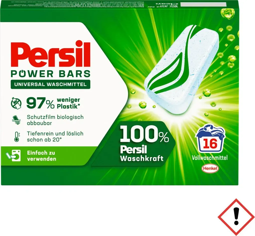 20,98 /kg - Kategorie: Waschmittel - Persil - GTIN:4015200030265 - Persil Universal Power Bars 16WL 16 Stück - Wäschepflege - Hersteller: Henkel AG & Co. KGaA, Henkelstraße 67, 40589 Düsseldorf --- --- Signalwort: ACHTUNG --- P101 - Ist ärztlicher Rat erforderlich, Verpackung oder Kennzeichnungsetikett bereithalten, P102 - Darf nicht in die Hände von Kindern gelangen, P280 - Schutzhandschuhe / Schutzkleidung / Augenschutz / Gesichtsschutz tragen, P302+P352 - BEI BERüHRUNG MIT DER HAUT: Mit viel Wasser waschen, P305+P351+P338 - BEI KONTAKT MIT DEN AUGEN: Einige Minuten lang behutsam mit Wasser ausspülen. Vorhandene Kontaktlinsen nach Möglichkeit entfernen. Weiter ausspülen, P337+P313 - Bei anhaltender Augenreizung: ärztlichen Rat einholen / ärztliche Hilfe hinzuziehen --- H315 - Verursacht Hautreizungen, H319 - Verursacht schwere Augenreizung Inhaltsstoffe: 15-30%:anionische Tenside,Bleichmittel auf Sauerstoffbasis,5-15%:Zeolithe, (DE) Persil Power Bars Uniwersalne kapsu ki do prania 427 g (PRODUKT Z NIEMIEC) - 10,49 Euro bei Kaufland.de - gefunden von billiger.de ![]() ![]() Persil POWER - BARS UNIVERSAL eBay Waschmittel löslich ab 20° 97% weniger Plastik