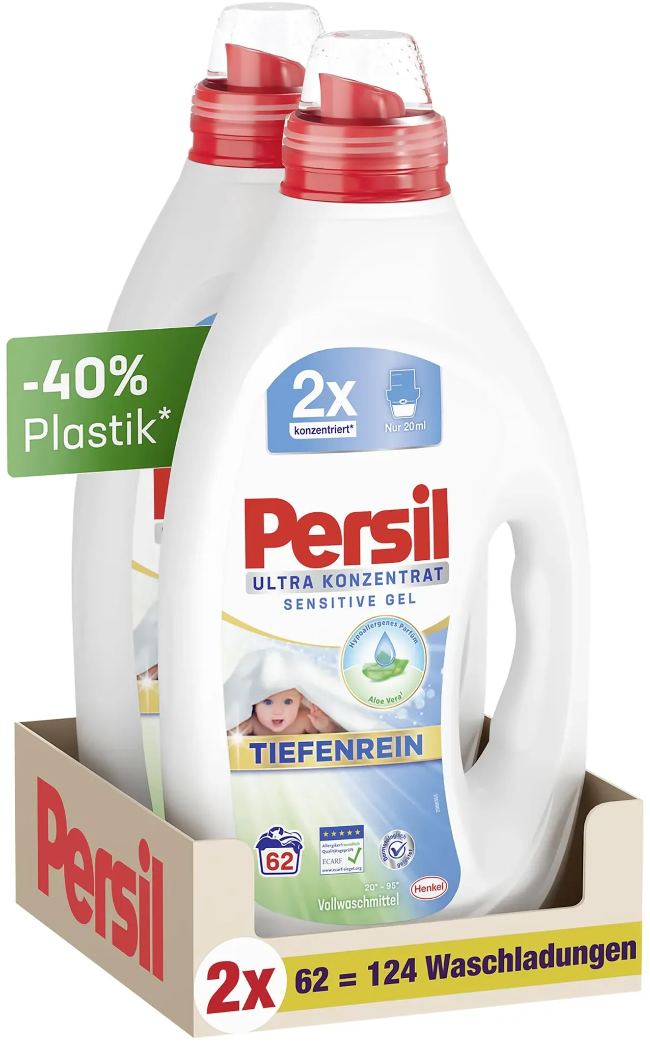 Persil - EAN: 4015100358728 - 2er-Pack Waschmittel-Konzentrat Ultra Sensitive Gel 62 WL, Waschladungen: 62 WL, Duftrichtung: frisch, Produktverwendung: besonders für Baumwoll-, Viskose- und Lyocellstoffe geeignet, Lieferumfang: 2 Flaschen Waschmittel-Konzentrat, Reinigung &... - bei otto-office.com - aus Yadore Produktdaten ![]() ![]() Persil Sensitive Gel (6 x 20 Waschladungen), Flüssigwaschmittel für Allergiker & Babys, mit beruhigender Aloe vera für sensible Haut, effektiv von 20 °C bis 95 °C