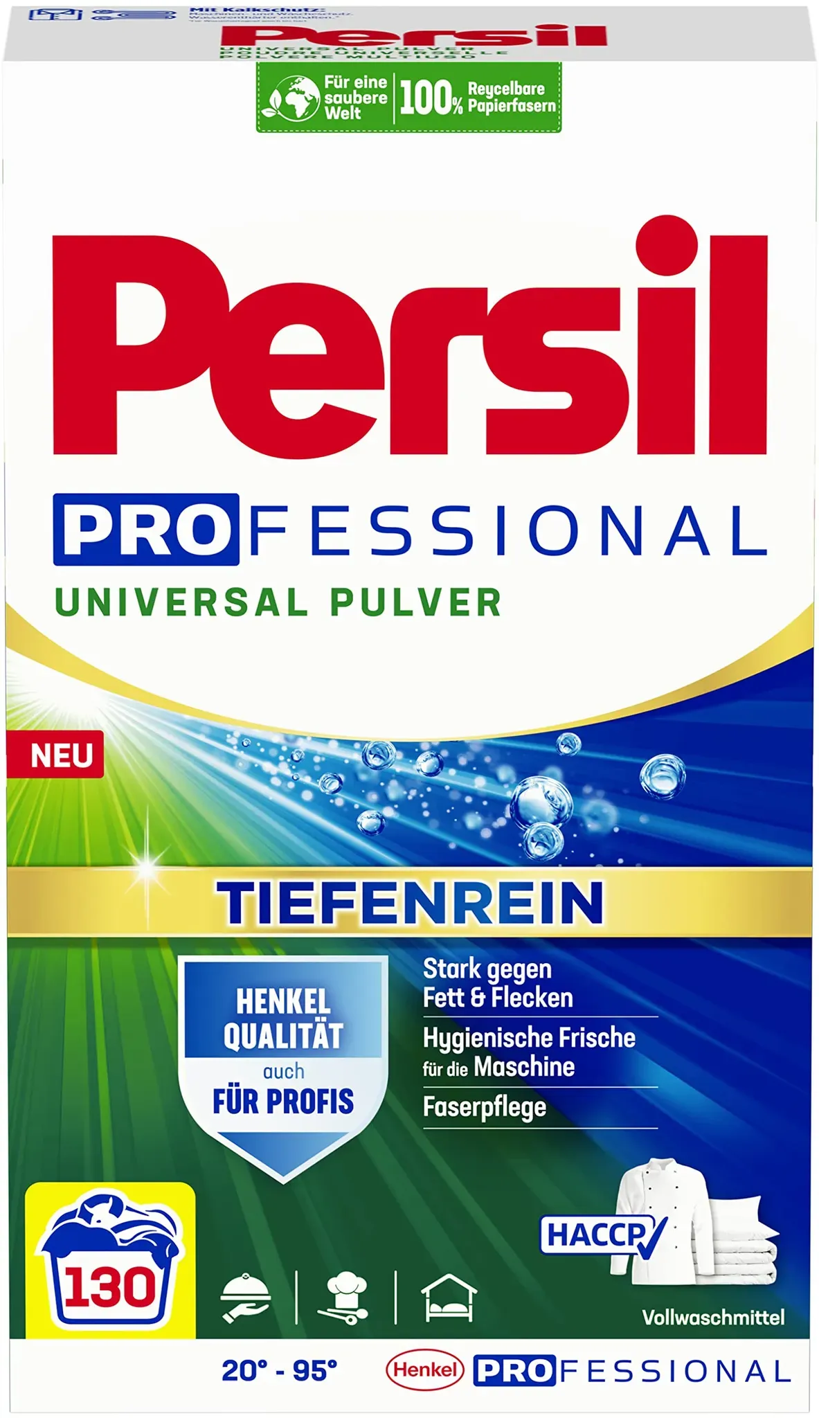 Zustand: Neu - 5,43 € / kg - Weiß- & Vollwäsche - Henkel - g26392 - EAN: 4015000351034 - Professional Universal - Das Waschmittel mit Tiefenreinigung Plus-Technologie entfernt selbst hartnäckigste Flecken wie Rotwein, Nudelsauce, Schokolade, Kaffee und Fett Strahlende Reinheit - Für den industriellen Einsatz entwickelt, bekämpft das Waschpulver selbst hartnäckige Lebensmittelflecken, für strahlend reine Textilien Optimaler Faserschutz - mit dem Waschmittel werden die Fasern beim Waschen vor Flusenbildung geschützt - moderne Pflege für beanspruchte Textilien Hygienische Frische - Mit Aktiv-Frische-Effekt bekämpft das Waschpulver Gerüche und sorgt für hygienische Frische und ein sicheres Gefühl, es ist HACCP zertifiziert* Nachhaltige Verpackung - Das Pulverwaschmittel für eine saubere Welt: Das Persil Waschmittel kommt in einer Verpackung aus 100% recycelbaren Papierfasern - 5 Händler im amazon.de Marketplace ![]() ![]() Persil Professional Universal Pulver (130 Waschladungen), Waschmittel Großpackung auch für Profis, Vollwaschmittel