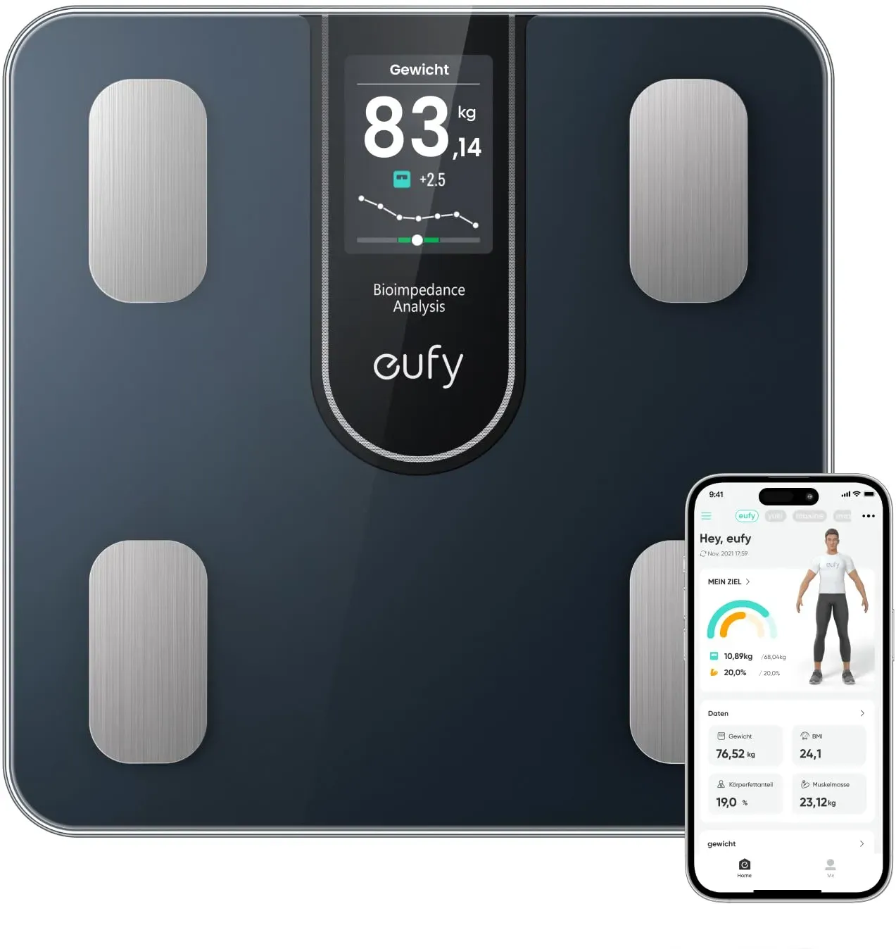 Kategorie: Personenwaagen - eufy - GTIN:0194644057619 - Alles auf einen Blick, ganz ohne Handy: Unsere clevere Waage zeigt dir direkt an deinen Füßen alle wichtigen Daten. Steig drauf und sieh deinen Fortschritt in Echtzeit das motiviert sofort! Ohne Ablenkung bleibt der Fokus auf deinen Zielen, was es dir leichter macht, dranzubleiben und jeden Erfolg zu feiern. 3,36-Zoll großes, leicht lesbares Display: Der Farb-TFT-Bildschirm bietet dir eine klare und umfassende Darstellung aller wichtigen Infos. Mit unserer Waage kannst du deine Gesundheitsdaten mühelos verfolgen und Veränderungen im Zeitverlauf erkennen. Die übersichtlichen Dashboards machen es leicht, deine Erfolge zu verstehen und zu visualisieren. Präzise und stabil: Unsere digitale Waage verfügt über eine spezielle Anti-Kipp-Basis und vier hochpräzise Sensoren, die dein Gewicht bis auf 0,05kg genau messen. 16 essentielle Körperwerte auf einen Blick: Mit der eufy Smart Scale C20 hast du deine Gesundheit im Griff. Sie misst Gewicht, Körperfett, Muskelmasse, viszerales Fett, Körperalter, Wasseranteil, Herzfrequenz, Körpertyp, BMI, Knochenmasse, Körperfettmasse, Protein, Skelettmuskelmasse, fettfreie Körpermasse, BMR und subkutanes Fett. Alle Werte sind übersichtlich auf der Waage ablesbar. Verschiedene Modi und Benutzer: Die Waage bietet sechs App-gestützte Modi. Normalmodus für alle Körperwerte, einfacher Modus für Schwangere und Personen mit Implantaten, Gastmodus für nur Gewichtsmessung, Baby- und Haustiermodus ... Die Withings Personenwaage Body für 59,88 Euro ist eine hochwertige WLAN-Smart-Waage mit BMI-Funktion und der Möglichkeit, bis zu 8 Benutzer zu verwalten. ![]() ![]()