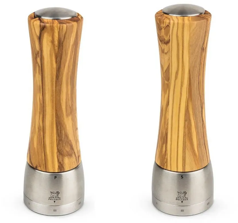Kategorie: Salz- & Pfeffermühlen - Peugeot - GTIN:4006950036164 - Peugeot Madras Manuelle Pfeffermühle u'Select aus Olivenholz 21cm Die 21cm hohe manuelle Pfeffermühle Madras sorgt für ein perfektes Gleichgewicht zwischen dem sanften, warmen Olivenholz und dem kalten, robusten Edelstahl. Zusätzlich zu einem modernen Stil bietet die Salzmühle Madras aus Holz die Wahl des gewünschten Mahlgrades mit einer Hand, über das einfallsreiche u Select-Einstellsystem. Ihre Erfolgsgeschichte reicht bereits in das Jahr 1840 zurück; seitdem hat sich die Marke längst weltweit als feste Bezugsgröße bei Gourmets und Spitzenköchen etabliert. Die exklusiven Mühlen sind zu renommierten Ikonen der Tischkultur geworden. - 99,00 Euro bei grimm-daheim - gefunden von billiger.de Dieses hochwertige Salz- und Pfeffermühlen-Set aus Olivenholz in 21 cm Höhe ist eine luxuriöse und funktionale Anschaffung. ![]() ![]()