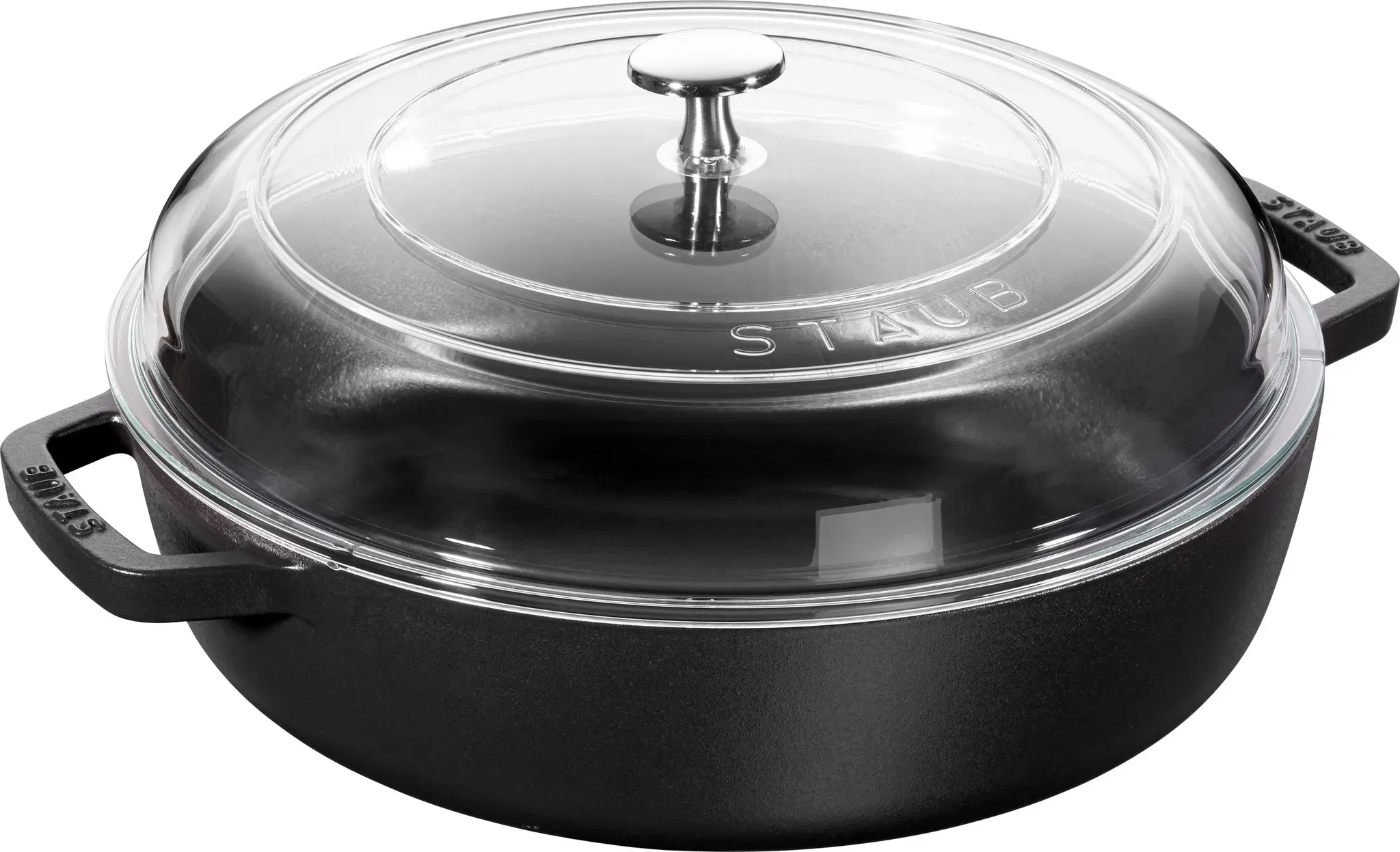 Kategorie: Pfannen - Fissler - GTIN:4009209379975 - Die Profi-Bratpfanne Original-Profi Collection von Fissler ist das ideale Gefäß zum Schmoren, Kasserollen und auch zum Servieren von Speisen. Sie ist nahezu unverwüstlich - aus hochresistenten Materialien gefertigt. Vorteile: Die Pfanne hat einen sehr hohen Rand und einen kuppelförmigen Deckel, der die Feuchtigkeit im Inneren der Pfanne hält. Sie hat eine kratzfeste, satinierte Oberfläche. Der Fissler Cookstar -Boden ist eine Konstruktion , die die Hitze gleichmäßig verteilt. Die bequemen, großen Griffe werden beim Kochen nicht heiß, so dass keine Ofenhandschuhe verwendet werden müssen. Der breite überlaufrand ist ein weiteres Highlight des Kochgeschirrs. Schicksal: Die Pfanne ist für alle Herdarten geeignet, auch für den Backofen und die Spülmaschine. Sie kann bei bis zu 230 C verwendet werden. Materialien: Aus rostfreiem Edelstahl 18/10 (bis zu 90% des Stahls sind recycelt). Gut zu wissen! Die gesamte Kollektion wurde in Deutschland hergestellt. Auf die Pfannen gibt es eine von 1 n. - 223,22 Euro bei Formadore - gefunden von billiger.de Die Staub Pfanne aus Gusseisen ist eine langlebige und hitzebeständige Option, ideal für Schmorgerichte und Braten. ![]() ![]() Staub Pfanne 28 cm schwarz aus Gusseisen mit zwei Griffen und einem Deckel