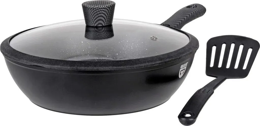 Kategorie: Pfannen - Gräwe - GTIN:4010094024598 - Die GRäWE Wok-Pfanne aus Aluminium ist ein unverzichtbares Werkzeug für jeden Kochliebhaber. Mit einem Durchmesser von 28 cm bietet sie genügend Platz für eine große Menge an Zutaten und ist somit ideal für die Zubereitung von asiatischen Gerichten. Die Pfanne wird mit einem passenden Glasdeckel geliefert, der das Kochen von Speisen erleichtert und das Aroma bewahrt.Die Antihaftbeschichtung Greblon C3 sorgt dafür, dass die Pfanne schnell und einfach zu reinigen ist und verhindert das Anhaften von Speisen. Die Pfanne ist in einer eleganten schwarz-grauen gesprenkelten Farbe gehalten und hat abnehmbare Griffe aus Kunststoff, die bis ca. 180 hitzebeständig sind. Der robuste, hitzebeständige Aluminiumkörper ist bis zu einer Temperatur von 230 ofenfest und hat einen ferromagnetischen Boden für Elektro- und Induktionsherde.Die GRäWE Wok-Pfanne wird mit einem Nylon-Pfannenwender geliefert, der eine Heberfläche mit 5 Längsstreben hat und bis ca. 180 erhitzbar ist. Der Griff hat ein Loch zum Aufhängen und ist ebenfalls schwarz.Diese Wok-Pfanne ist das ideale Küchenwerkzeug für jeden Koch und kann einfach und bequem über Amazon bestellt werden. Mit der GRäWE Wok-Pfanne aus Aluminium können Sie schnell und einfach köstliche Gerichte zubereiten und genießen.Lieferumfang:1 Wokpfanne 28 cm Aluminium, mit Deckel oben ges. ca. 28,7 cm, innen (ohne Rand) ca. 28 cm, Höhe ca. 7,5 cm, Boden ca. 21,5 cm, Grifflänge ca. 18,5 cm, Gewicht ca. 1015 ... Die KRÜGER Aluminium Großraumpfanne Gourmet bietet viel Volumen und ist für Induktionskochfelder geeignet, ideal für größere Mengen. ![]() Bratpfanne KRüGER 'Aluminium Großraumpfanne Gourmet, 28 cm', grau (dunkelgrau), H:7cm Ø:28cm, Pfannen, für Induktions-Kochfelder geeignet