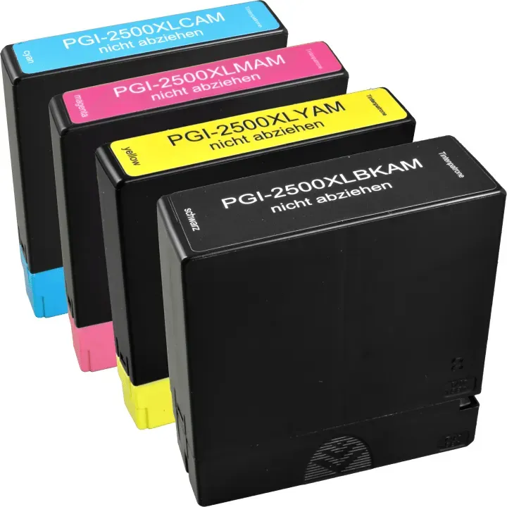 4 Händlerangebote bei billiger.de - Kategorie: Druckerpatronen - KMP - KMP Multipack C103V - Inhalt: 1x 71 ml / 3x 19 ml - Seiten: ca. 1x 2500 / 1x 1755 / 1x 1295 / 1x 1520 - Farbe: black / cyan / magenta / yellow - pigmentierte Tinte - Ersetzt Originalpatrone: PGI-2500XL BK/C/M/Y Mit den C103V Druckpatronen erhalten Sie hochwertige InkJet-Ausdrucke. Die speziell auf Ihr Drucksystem abgestimmte Patrone ist bestens geeignet für Texte, Grafiken und Fotos. Der Chip ist bereits darauf montiert und sofort einsatzbereit. Geeignet für: Canon Maxify IB 4050 / Maxify IB 4000 Series / Maxify MB 5050 / Maxify MB 5350 / Maxify MB 5000 Series / Maxify MB 5300 Series MerkmaleTintentypTinte auf PigmentbasisDruckfarbenBlack,Cyan,Magenta,YellowKompatibilitätCanon Maxify MB 5000 Series, Canon Maxify MB 5050, Canon Maxify MB 5100 Series, Canon Maxify MB 5150, Canon Maxify MB 5300 Series, Canon Maxify MB 5350, Canon Maxify MB 5400 Series, Canon Maxify MB 5450, Canon Maxify MB 5455, Canon Maxify iB 4000 Series, Canon Maxify iB 4050, Canon Maxify iB 4150, Canon Maxify MB 5155Supply typeMulti packAnzahl der schwarzen Tintenpatronen1Farbtintenpatronenanzahl3Seitenergebnis schwarze Tinte2500 Seiten KMP Produkte, die nicht den Erwartungen entsprechenwerden getauscht oder der Kaufpreis wird in vollemUmfang erstattet.Wir haften auch für den unwahrscheinlichen Fall,dass es durch den ordnungsgemäßen Einsatz einesKMP Produkts zu einem Schaden am Drucker kommt(Produkthaftungsgesetz). KMP MULTIPACK C103V - ... Ein Alza Multipack, das eine preisgünstige Option für ein 4-Farben-Set darstellt. ![]() ![]() Alza PGI-2500XL BK/C/M/Y Multipack für Canon Drucker