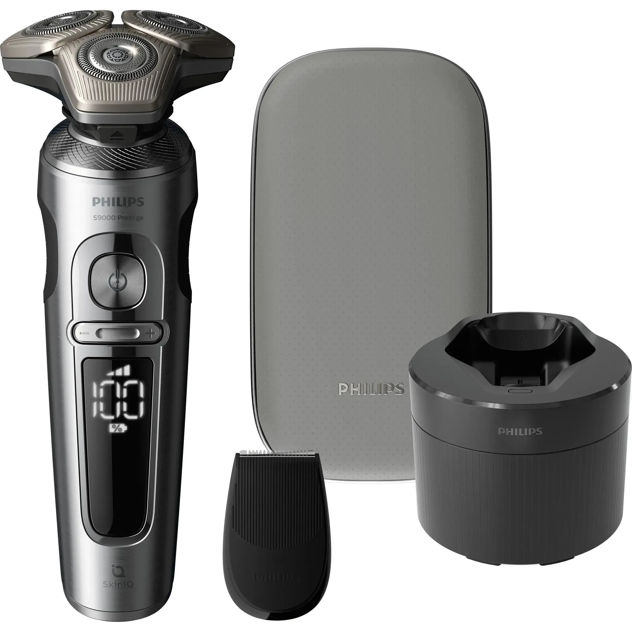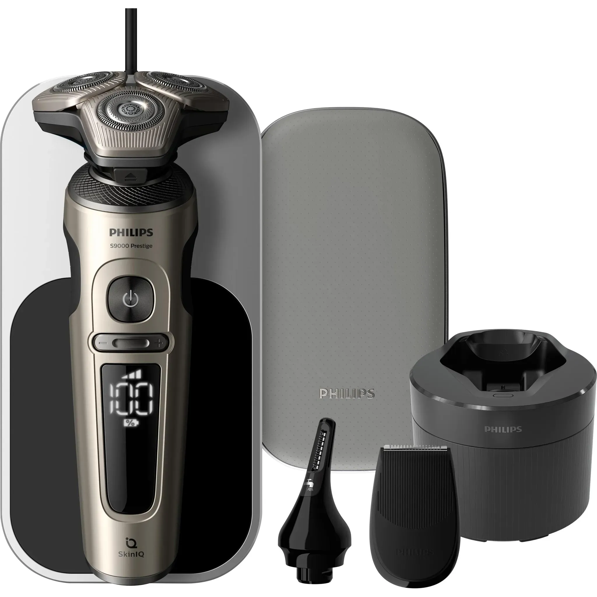 20 Händlerangebote bei billiger.de - Kategorie: Elektrische Rasierer - Philips - Für eine hautnahe Rasur mit SkinIQ Technologie Der Philips i9000 bietet dank des Triple Action Lift & Cut-Klingensystems und den flexiblen, kompakten 360 -Scherköpfe eine hautnahe Rasur, selbst an schwer erreichbaren Stellen. Die KI-gestützte SkinIQ Technologie erkennt und passt sich an deine Haut an - für ultimativen Komfort und Präzision. Philips i9000 Elektrischer Nass- und Trockenrasierer mit SkinIQ Philips i9000 X9000/30 Elektrischer Nass- und Trockenrasierer mit SkinIQ, Rotationstrasierer, Schwarz, SkinIQ, Android, iOS, Akku, Lithium-Ion (Li-Ion) Philips i9000 X9000/30 Elektrischer Nass- und Trockenrasierer mit SkinIQ. Rasierapparatsystem: Rotationstrasierer, Produktfarbe: Schwarz, Rasiersystemtechnologien: SkinIQ. Energiequelle: Akku, Akku-/Batterietechnologie: Lithium-Ion (Li-Ion), Akku-/Batterietyp: Integrierte Batterie. Funktionen der Rasierer-Basisstation: Ladend, Reinigung - GTIN:8720689036498 Dieses Modell der S9000 Prestige Serie ist ein Top-Angebot mit Reinigungsstation und Qi-Ladepad. ![]() ![]() PHILIPS Rasierer S9000 Prestige - Elektrischer Nass- und Trockenrasierer, glänzendes Chrom, Lift & Cut-Rasiersystem, SkinIQ-Technologie, Bartstyler, Reinigungsstation & Qi-Ladepad (Modell SP9885/35)