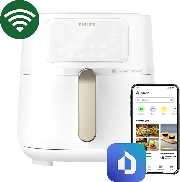 EAN: 8720389014871 - Ihr vernetzter Begleiter für gesunde Mahlzeiten für die ganze FamilieUnsere intuitive NutriU-App verbindet sich problemlos mit Ihrem Airfryer und wird so zu Ihrem täglichen Begleiter in der Küche. Damit können Sie nicht nur gesund frittieren, sondern auch neue aufregende Rezepte entdecken und teilen sowie den Kochvorgang aus der Ferne überwachen, damit Sie mehr Zeit für die Dinge haben, die Ihnen wirklich wichtig sind.Vielseitigkeit und Multifunktionalität vereint in einem AirfryerDie neuen vernetzten Philips Airfryer XXL der Serie 5000 verfügen über 16 verschiedene Kochfunktionen: Braten, Backen, Grillen, Rösten, Trocknen, Toasten, Auftauen, Aufwärmen, Fermentieren und vieles mehr.Gesund frittieren mit der Rapid Air TechnologieDie Rapid Air Technologie mit ihrem einzigartigen Seestern -Design wirbelt heiße Luft, um köstliche Speisen mit wenig bis gar keinem öl zuzubereiten, die außen knusprig und innen zart sind.Genießen Sie leckere Gerichte mit bis zu 90% weniger Fett!**Der vernetzte Philips Airfryer XXL der Serie 5000 verwendet heiße Luft, um Ihre Lieblingsspeisen perfekt knusprig zu garen, mit bis zu 90% weniger Fett.**Täglich leckere Airfryer-Rezepte für ein gesundes LebenEntdecken Sie die zahlreichen* köstlichen Airfryer-Rezepte, die gesund sind und schnell zubereitet werden können. Die Rezepte in der NutriU App werden von Ernährungsexperten für das tägliche Kochen ausgewählt.Auswählen, einstellen und entspannenWählen Sie ein Rezept aus, senden ... Dieser weiße Airfryer für 139.90 Euro bietet eine stilvolle Option mit Wifi-Verbindung und 16-in-1 Funktionen. ![]() ![]()
