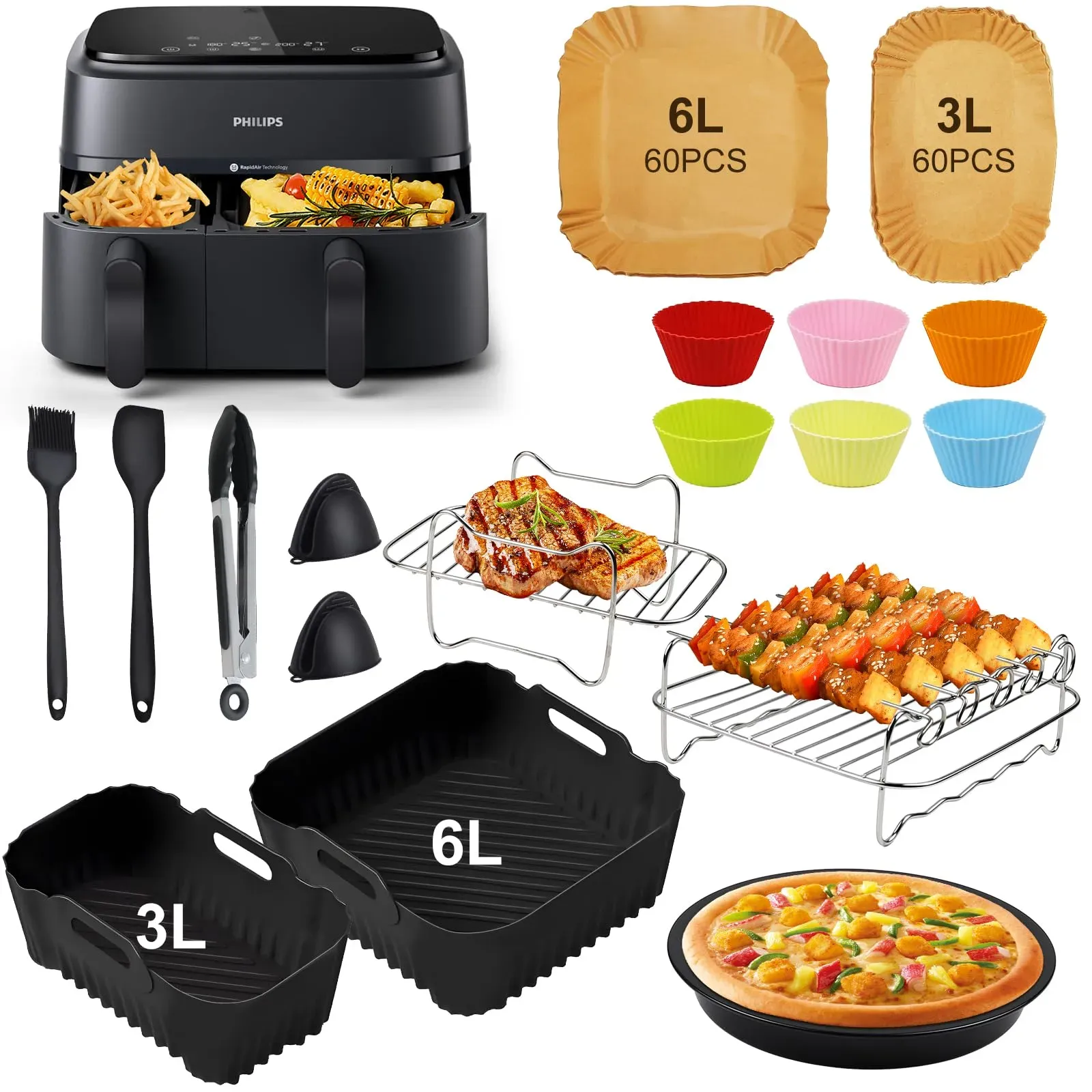 Auf Lager Versand durch AmazonAirfryer Zubehör für Philips, Heißluftfritteuse Zubehör für Philips Dual Basket 3000-5000 Serie NA350/NA550/NA555 6L/3L Silikonformen,Backpapier, Grillrost, Pizzaform,Küchenzange,usw