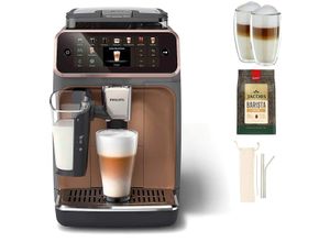 Kaffee Espresso Lifestyle Feinschmecker - - Bestseller. Bereiten Sie auf Tastendruck aromatische Kaffeespezialitäten wie Kaffee, Espresso, Cappuccino und Latte Macchiato zu. Das LatteGo Milchsystem verfeinert Ihren Kaffee mit samtig-cremigem Milchschaum, ist einfach einzurichten und ist in Sekundenschnelle hygienisch rein., Technische Daten: Mitgeliefertes Zubehör: Messlöffel, Wasserhärte-Teststreifen, AquaClean Filter, LatteGo Deckel, Leistung: 1500 W, Spannung: 230, Pumpendruck: 15 bar, Kabellänge: 1 m, Farbe Material: Farbbezeichnung: weiß und roségold, Handhabung Komfort: Appfunktionen: Füllmenge für jedes Getränk personalisieren, Kaffeestärke für jedes Getränk personalisieren, Temperatur für jedes Getränk personalisieren, Abtropfschaleneigenschaften: herausnehmbar, Art der Bedienung: Sensortasten, Brühgruppe herausnehmbar: herausnehmbar, Displaytechnologie: TFT-Farbdisplay, Bohnenbehälterkapazität: 275 g, Kaffeesatzbehälterkapazität: 12 Port., Milchtankkapazität: 0,26 l, Wassertankkapazität: 1,8 l, Tassenhöhe maximal: 15 cm, Kaffeezubereitung: Einstellmöglichkeiten Kaffeezubereitung: Aromawahl, Brühtemperatur, Kaffeestärke, Anzahl Heißwasser Temperaturstufen: 3, Mengenregulierung: Kaffeemenge, Mahlgradeinstellung: 12-stufig, Maße Gewicht: Höhe: 43,3 cm, Breite: 24,6 cm, Tiefe: 37,2 cm, Gewicht: 8 kg, Programme Funktionen: Direktwahltasten für: Espresso, Kaffee, Americano, Cappuccino, Latte Macchiato, Anzahl Speicherplätze für individuelle Kaffeespezialitäten: 4, ... Die 5500 Series bietet eine beeindruckende Auswahl von 20 Kaffeespezialitäten, heiß oder eisgekühlt, und ist ein Topseller. ![]() PHILIPS Kaffeevollautomat 'EP5547/90 5500 Series, 20 Kaffeespezialitäten (heiß oder eisgekühlt)', schwarz (matt, schwarz), B:24,6cm H:37,1cm T:43,3cm, Kaffeevollautomaten, LatteGo-Milchsystem, SilentBrew Technologie, Kaffeevollautomat, Topseller