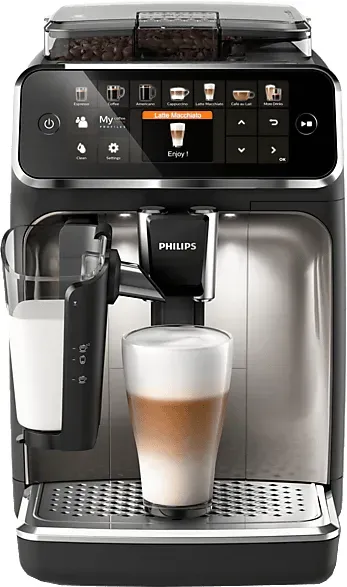 32 Händlerangebote bei billiger.de - Kategorie: Kaffeevollautomaten - Philips - Samtig-cremiger Schaum: Bereiten Sie mit dem LatteGo System samtig-cremigen Milchschaum zu es besteht aus nur zwei spülmaschinenfesten Teilen und ist daher leicht zu reinigen 12 Kaffeespezialitäten auf Fingertipp: Genießen Sie Ihren Lieblingskaffee, vom kräftigen Espresso bis zum milden Cappuccino Intuitives TFT-Display: Wählen Sie mit dem benutzerfreundlichen Touchscreen dieser Espressomaschine mühelos Ihr Getränk aus mit dem Coffee Customiser können Sie Aromastärke und Kaffeemenge anpassen Intensität Verstärken: Mit der ExtraShot Funktion erhalten Sie einen kräftigeren Geschmack ohne zusätzliche Bitterkeit Speicherfunktion: Bis zu 4 Personen können ihre ganz persönlichen Kaffeevorlieben speichern und mit der Coffee Customiser Funktion Intensität, Stärke und Milchmenge jedes Kaffees nach Wunsch anpassen - GTIN:8710103931324 Dieses Angebot von Stroewa.com ist mit 476.90 Euro eines der günstigsten für ein Neugerät und somit ideal für preisbewusste Käufer. ![]() ![]() Philips LatteGo 5400 Kaffeevollautomat Series EP5447/90
