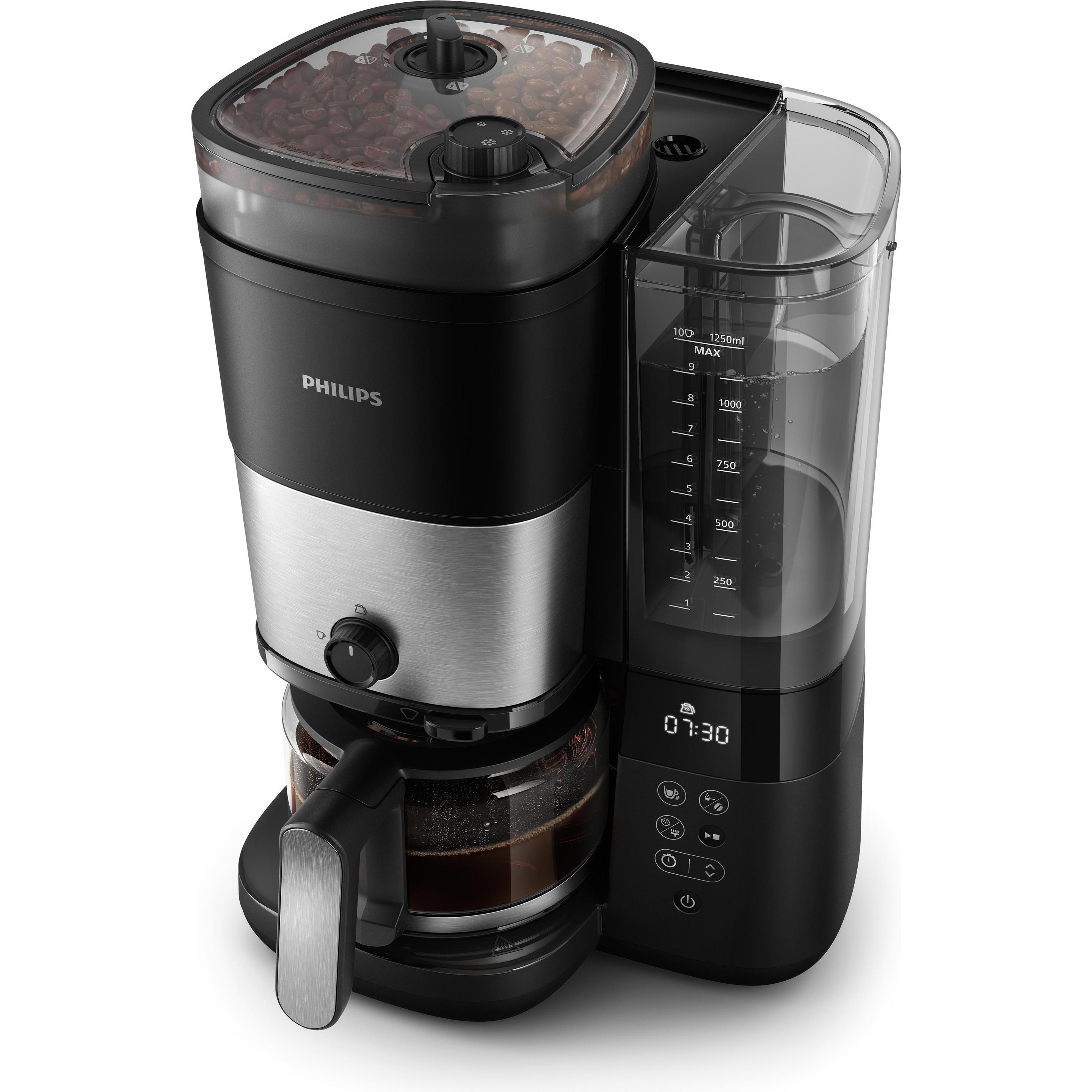 Kategorie: Kaffeemaschinen - Philips - GTIN:8720389024788 - ALL-IN-1-BREW - Brühen Sie in der Kanne oder direkt in Ihrer Lieblingstasse*, -becher* oder -glas**, um unterwegs auf dem Weg zur Arbeit zu trinken INTEGRIERTES KEGELMAHLWERK - Passen Sie den Mahlgrad an und entfalten Sie das volle Aroma Ihrer Bohnen; schalten Sie es aus, um fertigen Filterkaffee zu verwenden ABNEHMBARER DUO-BOHNEN-BEHäLTER MIT AROMAVERSCHLUSS - Lagern und mischen Sie zwei verschiedene Bohnensorten zusammen, oder wechseln Sie zwischen koffeinfreien und normalen Bohnen SMARTE DOSIERUNG - Sorgt bei jedem Brühvorgang für ein perfektes Verhältnis zwischen Wasser und Kaffee, sodass kein Rätselraten mehr nötig ist und weniger nachgefüllt werden muss; genießen Sie immer den besten Kaffee, niemals wässrig oder sauer EINFACHE REINIGUNG - Reinigen Sie den Filterhalter und den Dauerfilter nach jedem Gebrauch; wischen Sie den Filterhalter gründlich ab und achten Sie auf Kondensatbildung - 149,99 Euro bei Amazon Marketplace Kitchen - gefunden von billiger.de Dieses B-Ware-Angebot für 157,91 Euro ist eine gute Option, um ein fast neues Gerät zu einem reduzierten Preis zu erhalten. ![]() ![]() Philips HD7900/50 - 1,25 l eBay Kaffeemaschine Schwarz mit Mühle | B-WARE