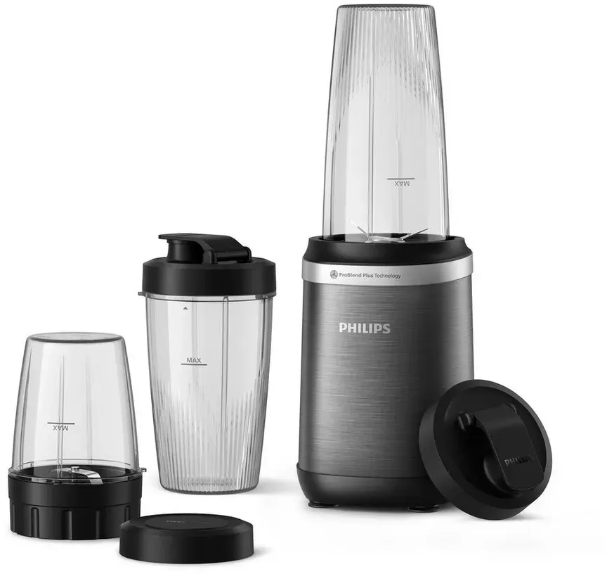 Philips - EAN: 8720389032547 - Der Philips HR2767/00 Standmixer aus der 5000 Series eignet sich vielseitig für die Zubereitung von Smoothies, Dips, Saucen und Pasten. Dank der innovativen ProBlend Plus Technologie werden auch harte Zutaten wie Nüsse oder Eiswürfel effizient verarbeitet für besonders feine und gleichmäßige Ergebnisse. Ausgestattet mit einem leistungsstarken ProBlend Plus Motor und einem speziell geformten Mixbehälter mit integrierten Rippen sorgt der Mixer für eine optimale Zirkulation der Zutaten und ein gleichmäßiges Mixergebnis. Ein zusätzlicher kleiner Becher mit flachem Messer ermöglicht das Mahlen von Kaffee und Gewürzen direkt im Gerät. Das kompakte und elegante Design fügt sich nahtlos in moderne Küchenumgebungen ein und spart gleichzeitig Platz. - bei saturn.de - aus Yadore Produktdaten ![]() Philips HR2767/00 5000 Series Standmixer Edelstahl/Schwarz (1000 Watt, 0.3 l, 0.5 0.7 l)