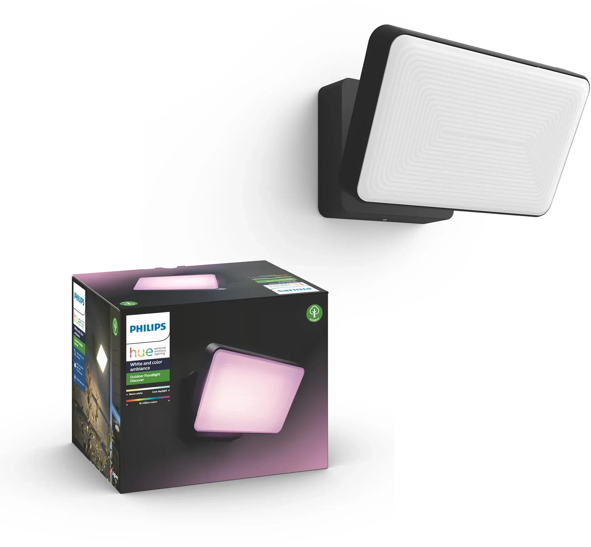 Philips Hue - EAN: 8718696170533 - Der moderne LED-Außenstrahler Philips Hue White and Color Ambiance Discover sorgt für eine farbenfrohe Außenbeleuchtung. Auch der Komfort und die Sicherheit werden nicht außer Acht gelassen: Einstellbare Zeitpläne für das Ein- und Ausschalten sowie... - bei lampenwelt.de - aus Yadore Produktdaten Dieses Angebot von coolblue ist eine gute Wahl für Nutzer, die direkt ein Bundle mit dem Outdoor-Sensor wünschen, auch wenn es im oberen Preissegment liegt. ![]() ![]() Philips Hue Discover Flutlicht White & Color für draußen + Outdoor-Sensor