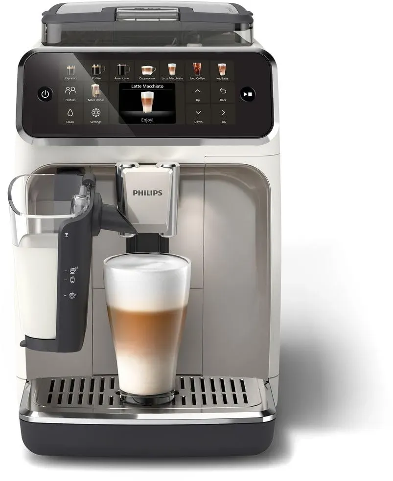8 Händlerangebote bei billiger.de - Kategorie: Kaffeevollautomaten - Philips - Getränkevielfalt: 20 verschiedene Kaffeesorten entdecken, vom heißen Espresso bis zum erfrischenden Eiskaffee, alle auf einen gleichmäßigen, köstlichen Geschmack abgestimmt, heiß oder eisgekühlt. One-Touch-LatteGo-Aufschäumung: Mit der leistungsstarken Zyklon-Aufschäumtechnologie bereiten Sie mühelos seidig-glatten Milchschaum zu, sogar mit pflanzlichen Alternativen - mit nur einer Berührung. Verbesserter Geschmack und Aroma: Den Kaffee verbessern mit der Philips Serie 5500, die über ein Keramikmahlwerk und 12 Mahlgradeinstellungen für vollen Geschmack und 5 Aromastärken verfügt. SilentBrew-Technologie: Tauchen Sie ein in das köstliche Aroma Ihres Kaffees mit der SilentBrew-Technologie, die die Maschinengeräusche um 40% reduziert. Intuitives Display: Kaffeeerlebnis über ein einfaches Display anpassen und Stärke, Kaffeelänge und Milchmenge einstellen. Speichern Sie Vorlieben in zwei Benutzerprofilen für individuellen Komfort. - GTIN:8720389032301 Die weiße EP5543/90 mit Farb-Touchdisplay ist hier zu einem guten Preis erhältlich und bietet eine moderne Bedienung. ![]() ![]() PHILIPS 5500 Series Kaffeevollautomat €“ 20 Getränke, Modernes Farb-Touchdisplay, LatteGo-Milchsystem, SilentBrew-Technologie, 100% Keramikmahlwerk, QuickStart, 1,8L Wassertank, Weißchrom (EP5543/90)