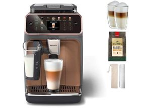 Zustand: Neu - Kaffeevollautomaten - Philips - EP5546/70 - EAN: 8720389032295 - 20 HEIßE UND KALTE KAFFEESPEZIALITÄTEN AUS FRICH GEMAHLENEN BOHNEN: Espresso, Café, Cappuccino, Latte macchiato, Iced Café, Americano, Café Crema, Latte, Ristretto, Milchkaffee, Iced Americano, Iced Espresso und mehr... Mit 20 Spezialitäten zur Wahl finden Sie all Ihre Café-Favoriten und noch mehr! LATTEGO MILCHSYSTEM: Zaubern Sie samtig cremigen Milchschaum auf Knopfdruck, sogar mit pflanzlichen Milchalternativen SILENT BREW TECHNOLOGIE: Unsere patentierte SilentBrew Technologie reduziert die Geräusche der Maschine, sodass Sie ein noch besseres Erlebnis bei der Zubereitung von aromatischem Kaffee haben. Dank Schallschutz und leisem Mahlvorgang erzeugen unsere Maschinen 40 % weniger Lärm als frühere Modelle und verfügen über eine Quiet Mark-Zertifizierung. EINFACH ZU REINIGENDES LATTEGO MILCHSYSTEM: Mit nur 2 Teilen und ohne Schläuche kann unser Milchsystem in weniger als 10 Sekunden gereinigt werden der Spülvorgang erfolgt, wenn sich die Maschine abschaltet. QUICKSTART: Unsere QuickStart-Funktion ermöglicht es Ihnen, Ihre Maschine einzuschalten und sofort einen Kaffee zu brühen. Ihr Gerät heizt entsprechend dem ausgewählten Rezept auf. - bei Amazon.de Dieses Angebot von Baur Versand für das Modell EP5544/80 in Grau/Kupfer ist ein Topseller und bietet 20 Kaffeespezialitäten. ![]() PHILIPS Kaffeevollautomat 'EP5544/80 5500 Series, 20 Kaffeespezialitäten (heiß oder eisgekühlt)', grau (grau, kupfer), B:24,6cm H:37,1cm T:43,3cm, Kaffeevollautomaten, LatteGo-Milchsystem, SilentBrew Technologie, Grau/Kupfer, Topseller