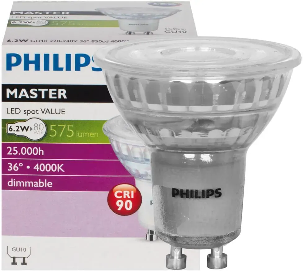 Verfügbarkeit: Lieferzeit 2-4 Arbeitstage - EEK: F - Kategorie: LED-Lampen - Philips - GTIN:8721103038272 - PHILIPS MASTER LEDspot Value 6,2-80W GU10 ersetzt 80W Halogenleuchtmittel, durchschnittliche Lebensdauer 25.000 Stunden, dimmbar, Ø 50mm, Länge 54mm, Ra 90, für Netzspannung 230V Technische Daten Sockel: GU10 Abstrahlwinkel: 36° Lichtstrom: 575lm Gesamtleistung: 6,2W Farbtemperatur: 3000K Energieeffizienzklasse: A++ Dimmbar: Dimmer Farbwiedergabeindex: Ra 90 Nennlebensdauer: 25.000 Stunden, Energieeffizienzklasse F, Lichtstrom 575lm, Elektrische Nennleistung 6,2W - 7,90 Euro bei hl-elektroshop - gefunden von billiger.de Dieses 6er-Pack für 9,54 Euro ist ein hervorragendes Angebot für alle, die mehrere dimmbare Philips LED Classic GU10 Lampen benötigen. ![]() ![]() Philips LED Classic GU10 Lampen Warm Glow 6-er Pack (50 W), dimmbare Reflektor LED Spots mit warmweißem Licht, energiesparende Lampen mit langer Nutzlebensdauer, Warmglow Dimmbar