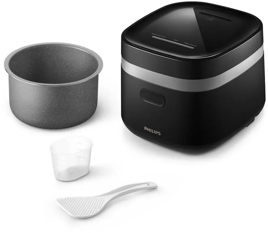 Auf Lager Versand durch AmazonPhilips Multi-Reiskocher 3000-Serie ? 0,85 l, 8 Kochfunktionen, 4-lagiger Antihaft-Topf, 30-Minuten-Schnellkochmodus, Fuzzy-Logik, Schwarz-Silber-Design (HD3093/80)