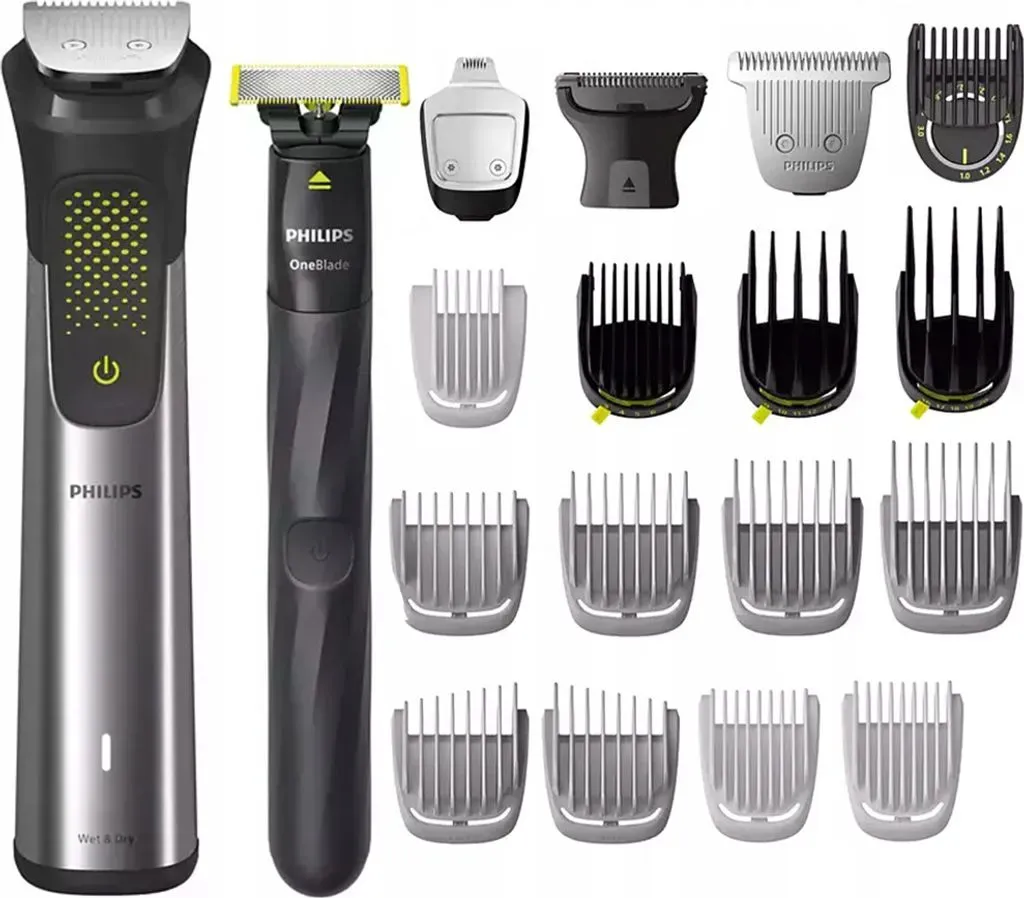 Kategorie: Elektrische Rasierer - Philips - GTIN:8720689019538 - Philips MG9553/15 Series 9000 + OneBlade-RasiererDas Philips Series 9000 und OneBlade Rasiererset ist die perfekte Wahl für die komplette Gesichts-, Haar- und Körperpflege. Mit diesem Komplettset können Sie eine Vielzahl von Aufgaben durchführen, einschließlich Bartpflege, Haartrimmen und präzises Trimmen von Ohrhaaren. Diese Kombination ermöglicht es Ihnen, Ihren eigenen Stil zu kreieren.Der Trimmer konzentriert sich auf die Pflege von Haaren, dickenBärtenund Körperhaaren, während der OneBlade Ihren Bart präzise nach Ihren persönlichen Vorlieben formt. Es ist eine Komplettlösung für die Pflege ohne zusätzliche Werkzeuge.PräzisionsaufsatzDer patentierte Kammaufsatz bietet 11 Längeneinstellungen von 1 bis 3 mm, mit denen Sie präzise auf die gewünschte Länge schneiden können. Außerdem bleiben die Edelstahlklingen des Rasierers lange Zeit scharf und müssen nicht mehr geölt werden.Entdecken Sie die Präzision des OneBladeOneBlade ist ein spezielles Werkzeug zum Erzielen präziser Linien und scharfer Formen. Die Klingen mit abgerundeten Spitzen ermöglichen eine klare Konturierung ohne das Risiko, die Haut zu verletzen. Mit einer Leistung von bis zu 6.000 Hüben pro Minute bewältigt der OneBlade selbst härtere Stoppeln und liefert präzise und detaillierte Ergebnisse.Eine Vielzahl von AufsätzenDas Set enthält eine Vielzahl von Aufsätzen, mit denen Sie die Länge nach Ihren Wünschen einstellen können. Insgesamt gibt es ... Dieses Modell ist ein hochwertiger Philips OneBlade Pro 360 mit Chromdesign und vielen Funktionen. ![]() ![]() PHILIPS QP6652/61 OneBlade Pro 360 Elektrorasierer, Barttrimmer, Chromdesign