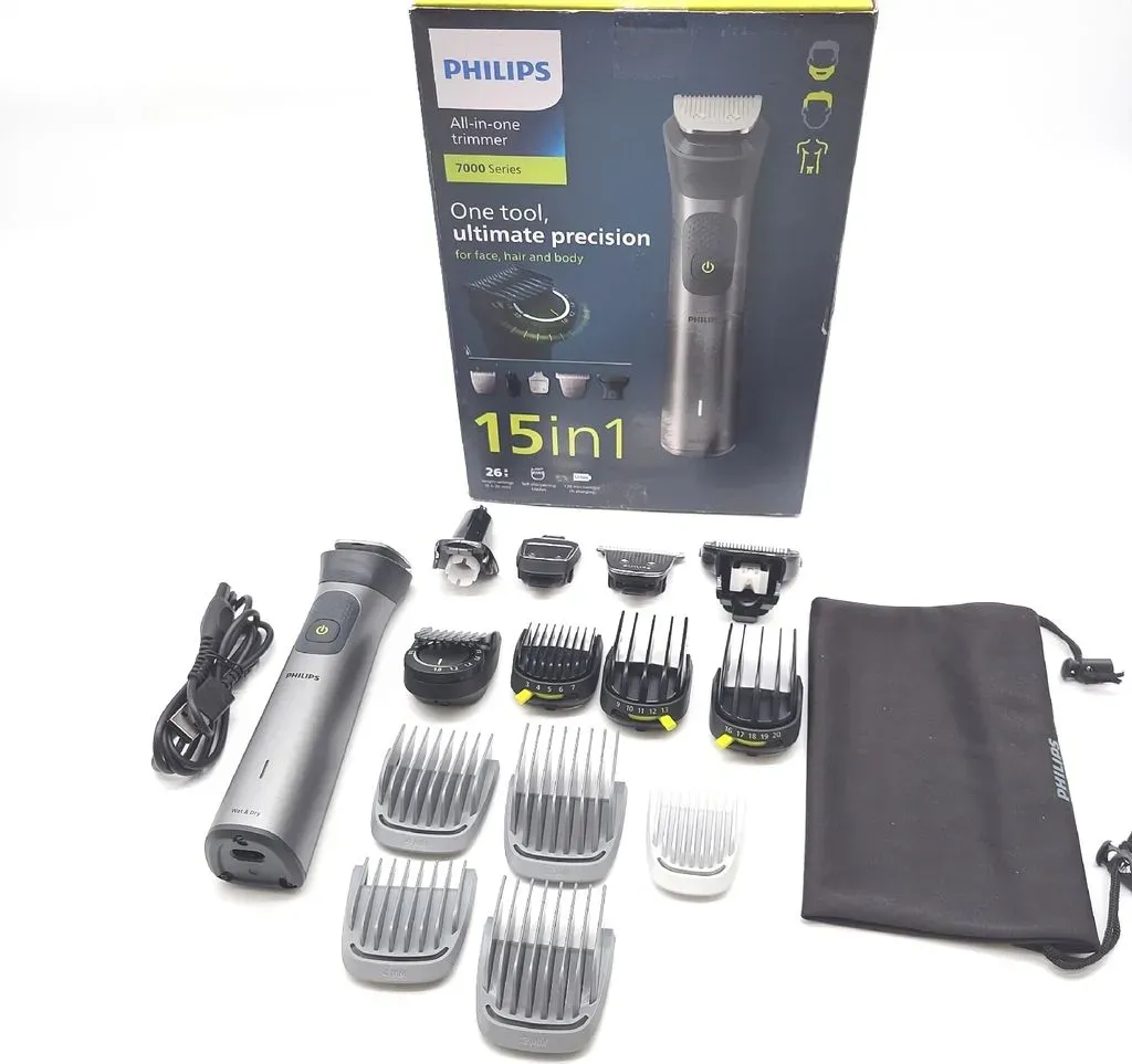 Kategorie: Elektrische Rasierer - Philips - GTIN:8720689002271 - Ein Gerät, ultimative Präzision Für Gesicht, Haar & Körper Kreieren Sie mit dem vielseitigen Trimmer und seinen 15 Aufsätzen zum Stylen von Bart und Haaren Ihren eigenen Look. Der Präzisionskamm sorgt für ein gleichmäßiges Trimmergebnis auf die gewünschte Haarlänge. Produktfarbe:GrauAnzahl der Längenschritte:26geeignet für den ganzen Körper:JaMinimum Haarlänge:0,5 mmMaximum Haarlänge:2 cmStufe präzise:0,2 mmNass & Trocken:JaPräzisionstrimmer:JaZweck Präzisionstrimmer:Bart, Ohr, NaseSelbstschärfende Rollen:JaErgonomischer Griff:JaDrahtlos:JaWasserfest:JaEnergiequelle:AkkuBetriebsdauer:120 minWiederaufladbar:JaAkku-/Batterietyp:Integrierte BatterieLadezeit:1 hAkku-/Batterietechnologie:Lithium-Ion (Li-Ion)Akku-/Batteriespannung:5 VSchnellladung:JaSchnellladungszeit:5 minAnzahl der Befestigungen:15Reinigungsbürste:JaAufbewahrungstasche:Ja Erleben Sie präzises und vielseitiges Styling mit dem Philips Barttrimmer 7000 Serie Multigroom. Entwickelt für den modernen Mann, bietet dieses hochwertige Gerät langlebige Klingen und individuell einstellbare Längenstufen für perfekten Halt und Konturpflege. Ob Bart, Schnurrbart, Koteletten oder auch Körperhaare der leistungsstarke Motor sorgt für gleichmäßiges Schneiden ohne Zerren. Dank ergonomischem Design und kabellosem Betrieb ist die Handhabung besonders komfortabel. Die wasserfesten Komponenten ermöglichen eine einfache Reinigung unter fließendem Wasser. Mit praktischem ... Dieser Multigroomer bietet 17-in-1-Funktionen und selbstschärfende Metallklingen für maximale Vielseitigkeit. ![]() ![]()