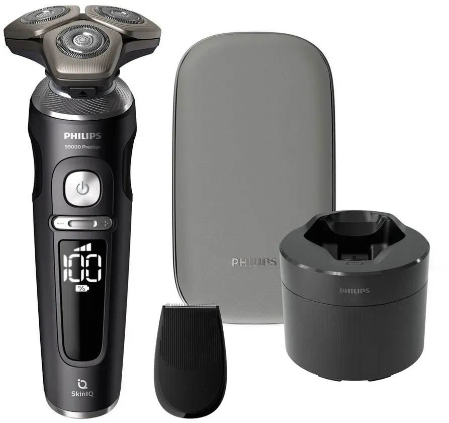Philips - EAN: 8720689004329 - Von der Nummer 1 unter den Elektrorasierern : ultimative Hautnähe und Komfort selbst bei einem dichten 7-Tage-Bart; mit der intelligenten SkinIQ-Technologie erkennt er Sie und passt sich Ihnen anHautnahe Rasur: Schneidet die Haare in jede Richtung mit den um 360 Grad drehbaren NanoTech DualPrecision-Klingen und erreicht mit dem Lift & Cut-Rasiersystem bis zu 0,00 mm HautnähePasst sich jeder Gesichtskontur an: Mit dem Ultraflex Suspension System erfasst dieser Rasierer und Trimmer die Haare auch an schwierigen Stellen wie dem Hals oder der OberlippeUltimativer Komfort: Die Hydro SkinGlide-Beschichtung sorgt für ein 50 % sanfteres Gleiten auf der Haut , während der Power Adapt Sensor die Haare 500 Mal pro Sekunde erfasst und die Schnittleistung anpasstEntwickelt für das Leben, gebaut für die Ewigkeit: Lebensdauer von Motor und Akku und Lebensdauer der selbstschärfenden Stahlklingen - ein Gesichtsrasierer, der jeden Tag funktioniertDas Set enthält: 1x Philips Series 9000 Prestige, 1x Bartstyler, 1x Premium-Etui, 1x Quick Clean Pod mit Kartusche, 1x Reinigungsbürste Der gründlichste Elektrorasierer von Philips: Erleben Sie ultimative Präzision und Hautschonung, auch bei Sieben-Tage-BartHautnahe Rasur: NanoTech DualPrecision Klingen mit Lift & Cut-System ermöglichen eine gründliche Rasur ohne Kompromisse beim HautkomfortEntwickelt für eine lange Lebensdauer: Lebensdauer von Motor und Akku sowie Stahlklingen, die sich lang selbst schärfen. ... ![]() ![]() Philips S9000 - Prestige Rasierer eBay - Elektrisch, Nass/Trocken, SkinIQ, Qi-Ladepad