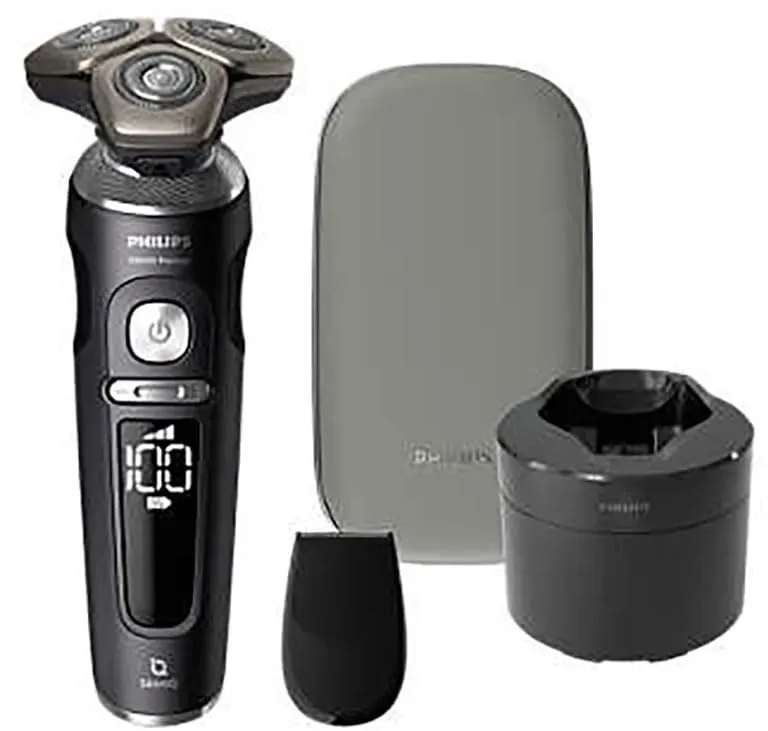 Zustand: Neu - Rotationsrasierer Rotationsrasierer für Herren - PHILIPS Philips Consumer Lifestyle B.V. - SP9871/22 - EAN: 8710103999850 - Von der Nummer 1 unter den Elektrorasierern¹: ultimative Hautnähe und Komfort selbst bei einem dichten 7-Tage-Bart; mit der intelligenten SkinIQ-Technologie erkennt er Sie und passt sich Ihnen an Hautnahe Rasur: Schneidet die Haare in jede Richtung mit den um 360 Grad drehbaren NanoTech DualPrecision-Klingen und erreicht mit dem Lift & Cut-Rasiersystem bis zu 0,00 mm Hautnähe Passt sich jeder Gesichtskontur an: Mit dem Ultraflex Suspension System erfasst dieser Rasierer und Trimmer die Haare auch an schwierigen Stellen wie dem Hals oder der Oberlippe Ultimativer Komfort: Die Hydro SkinGlide-Beschichtung sorgt für ein 50 % sanfteres Gleiten auf der Haut², während der Power Adapt Sensor die Haare 500 Mal pro Sekunde erfasst und die Schnittleistung anpasst Entwickelt für das Leben, gebaut für die Ewigkeit: Lebensdauer von Motor und Akku und Lebensdauer der selbstschärfenden Stahlklingen - ein Gesichtsrasierer, der jeden Tag wie neu funktioniert Das Set enthält: 1x Philips Series 9000 Prestige, 1x Nasentrimmer, 1x Bartstyler, 1x Premium-Etui, 1x Qi-Ladepad, 1x Reinigungsbürste - bei Amazon.de ![]() kaufland.d e Philips Rasierer S9000 Prestige Elektrischer Trockenrasierer Schwarz matt Deluxe