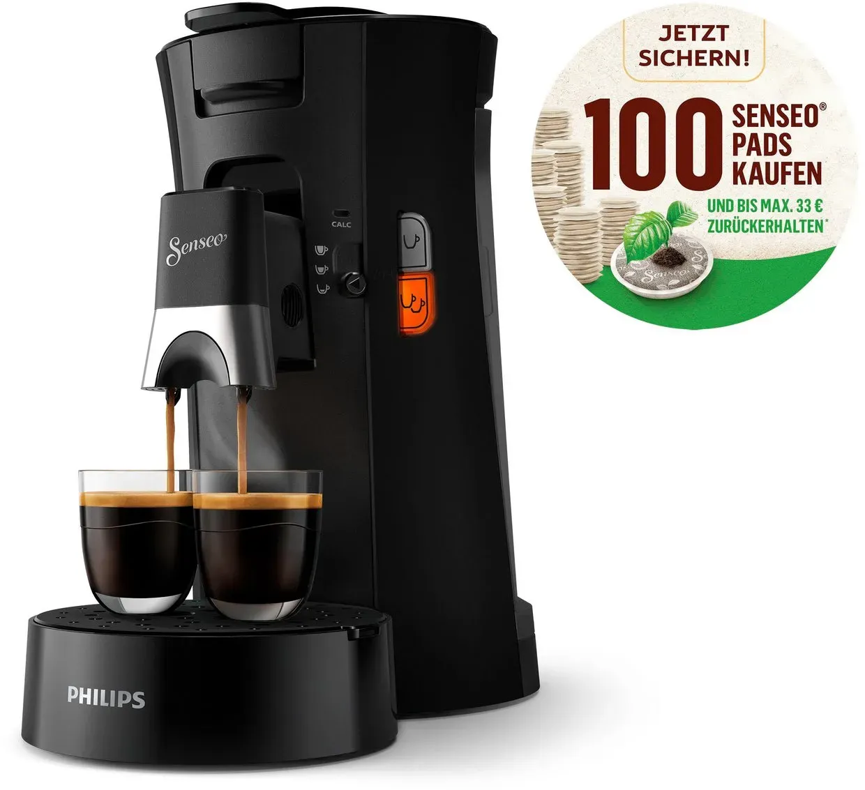 Philips - EAN: 8710103938118 - Erlebe deinen SENSEO Kaffee mit Liebe zur Umwelt. Mit dem intuitiven Schieberegler zur Auswahl der Kaffeestärke genießt du jetzt auf Tastendruck drei Kaffeespezialitäten. - bei philips.de - aus Yadore Produktdaten Dieses Angebot von OTTO hebt sich durch die Verwendung von 21% recyceltem Plastik und eine attraktive Pad-Aktion hervor. ![]() ![]() Philips Senseo Kaffeepadmaschine Select CSA230/69, mit drei Kaffee-Einstellungen, aus 21% rec. Plastik, 100 Senseo Pads kaufen und bis zu 33 € zurückerhalten schwarz