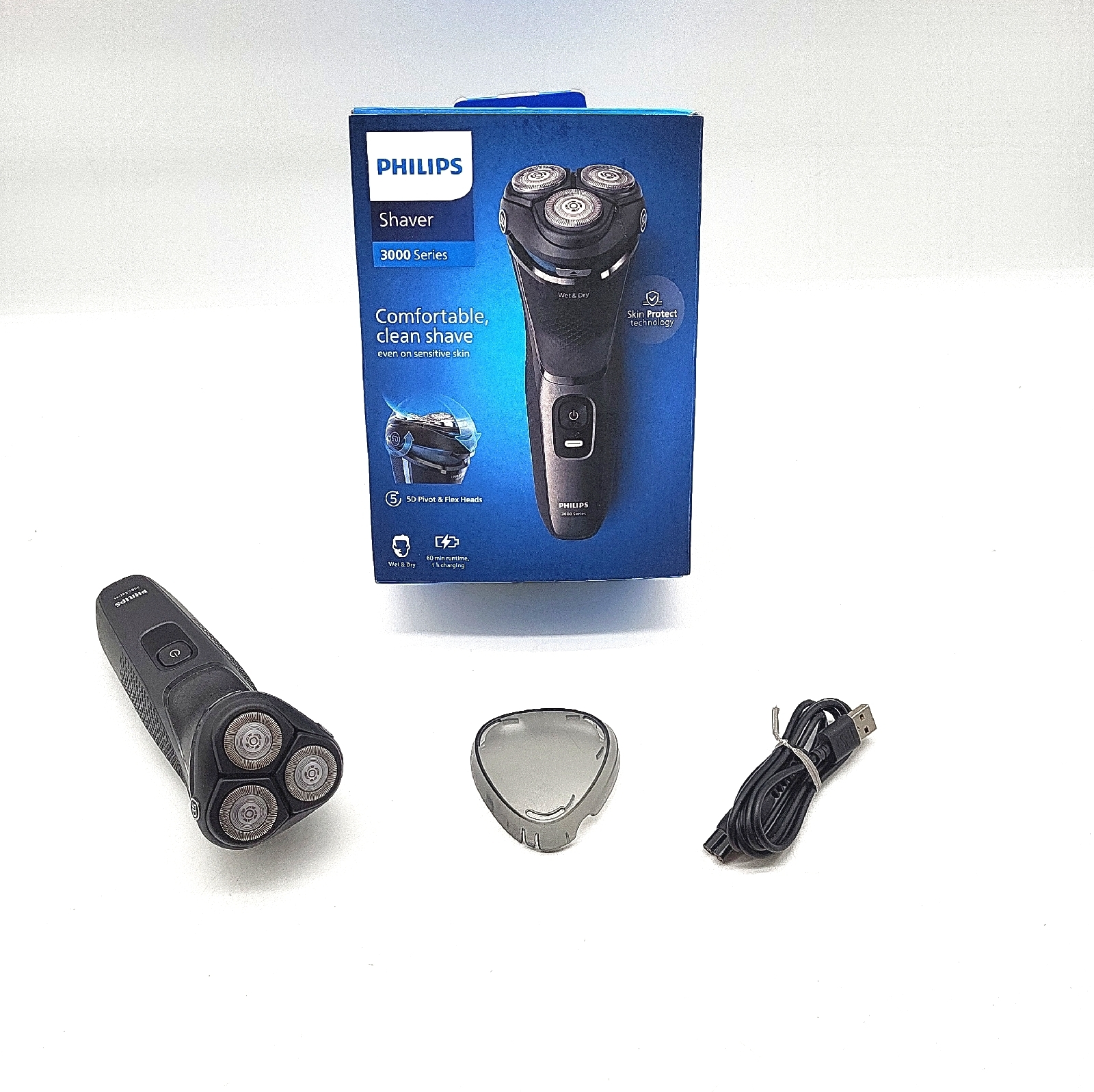 EAN: 8720689018562 - Funktion: Voll funktionsfähigLieferumfang: Lieferumfang gemäß Abbildungen (nur die auf den Bildern gezeigten Teile sind enthalten)Der Artikel wurde von uns gereinigt und auf seine Funktionalität geprüft.ProduktbeschreibungVon der weltweit führenden Marke für Elektrorasierer*: Der Philips Shaver Series 3000 ist ein elektrischer Nass- und Trockenrasierer mit SkinProtect-Technologie, der Ihnen eine angenehme, gründliche Rasur selbst bei empfindlicher Haut bietet. Das PowerCut Schersystem ist selbstschärfend und schneidet jedes Haar direkt über der Hautoberfläche für ein glattes Finish, während die 5-dimensional beweglichen Flex-Scherköpfe jeder Gesichtsform folgen sie schneiden direkt über der Hautoberfläche und schützen sie vor Schnittverletzungen. Unsere Rasierklingen aus hypoallergenem Stahl verhindern eine Korrosion der Klingen, beugen Unreinheiten vor und schützen Ihre Haut. Rasieren Sie sich nass oder trocken und definieren Sie Ihren Schnurrbart oder Ihre Koteletten mit dem integrierten ausklappbaren Trimmer. Reinigen Sie ihren Rasierer mit nur einem Tastendruck und spülen Sie ihn ganz einfach unter fließendem Wasser ab. Mit einer 1-stündigen Ladung erhalten Sie dank dem leistungsstarken Lithium-Ionen-Akku bis zu 60 Minuten Rasierzeit. Folgen Sie Ihren Gesichtskonturen für eine gründliche Rasur. Der Rasierer passt sich Ihrem Bart für eine mühelose Rasur an. Haben Sie es eilig? Eine 5-minütige Schnellladung bietet Ihnen ausreichend Leistung für eine ... ![]() ![]()