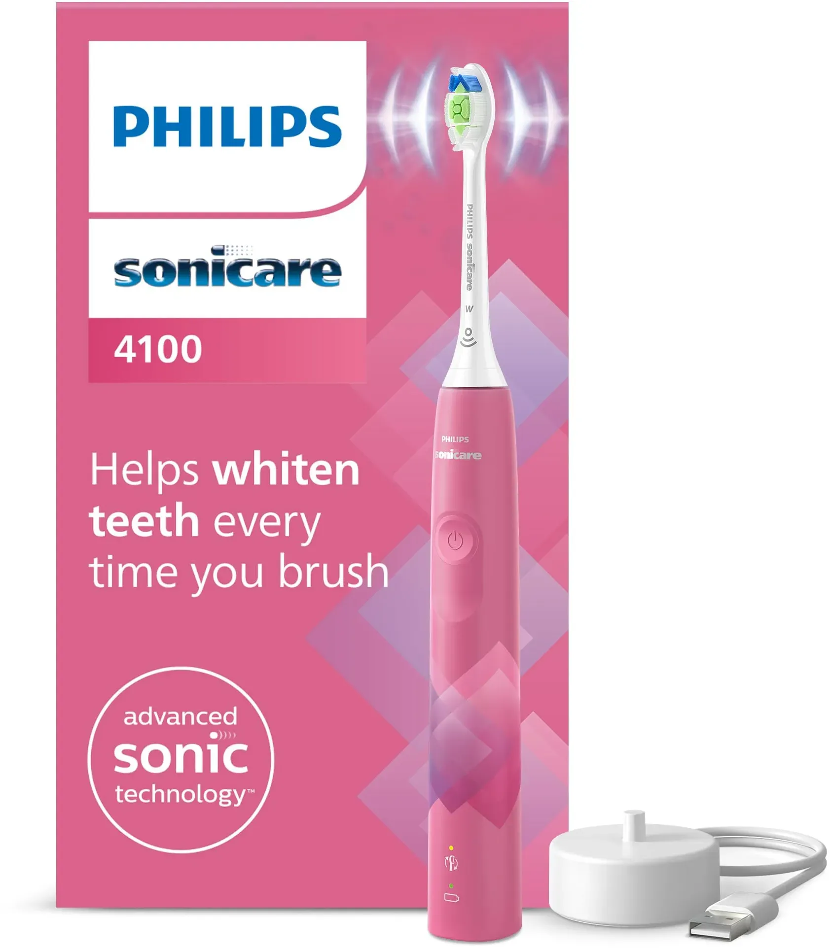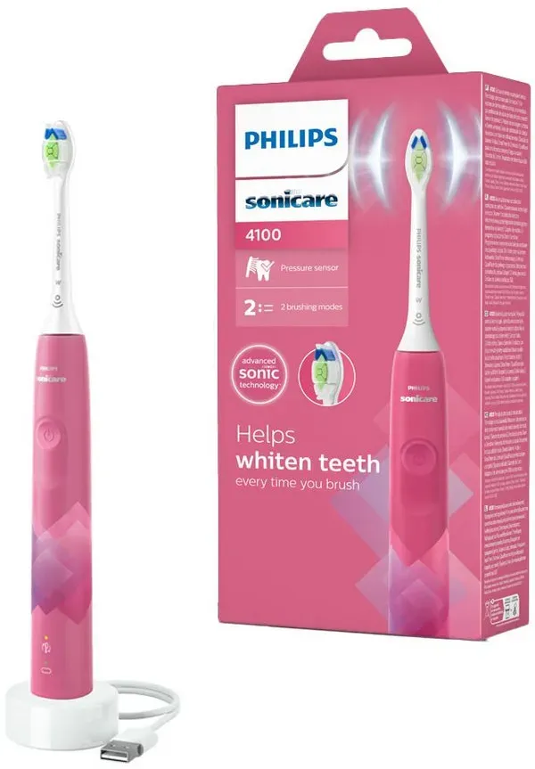 Zustand: Gebraucht - Schall Schallzahnbürsten - Philips Philips Consumer Lifestyle B.V. - HX3689/41 - EAN: 8720689034791 - Elektrische Zahnbürste für Erwachsene für eine effiziente Mundpflege: Sorgt mit dem W2 Optimal White Bürstenkopf vom ersten Tag an für weißere Zähne Sanfte und dennoch effiziente Reinigung mit der fortschrittlichen Schalltechnologie, die Wasser in die Zahnzwischenräume und entlang des Zahnfleischrandes spült Sicher und sanft: Wenn Sie zu viel Druck ausüben, pulsiert das Handstück leicht und erinnert Sie daran, den Druck zu verringern, wodurch Zähne und Zahnfleisch geschützt werden EasyStart für eine allmähliche, sanfte Erhöhung der Putzleistung, 2-Minuten-Timer für die empfohlene Putzzeit von 2 Minuten und 4-Quadranten-Timer für eine bessere Einhaltung der Putzeinstellungen Die von Zahnartzpraxen am häufigsten empfohlene Schallzahnbürstenmarke weltweit¹: Profitieren Sie von der Expertise von Philips, um Zähne und Zahnfleisch optimal zu pflegen Das Set umfasst 1x Philips Sonicare 4100 elektrische Zahnbürste mit Schalltechnologie, 1x W2 Optimal White Bürstenkopf, 1x Ladegerät - 1 Händler im amazon.de Marketplace Eine günstige rosa Sonicare 4100, die zusätzlich einen Aufsteckbürstenkopf enthält. ![]() ![]() Philips Sonicare 4100 HX3689/41 rosa + Aufsteckbürste 1 St.