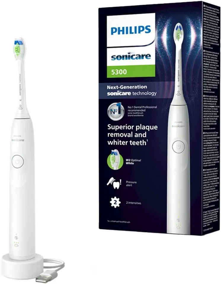 Sonicare - EAN: 8720689021418 - Die Philips Sonicare 5300 verfügt über Sonicare Technologie der nächsten Generation, 2 Intensitätsstufen und eine integrierte Andruckkontrolle, die Sie warnt, wenn mit zu viel Druck geputzt wird. Mit dem W2 Optimal White Bürstenkopf für strahlend weiße Zähne. - bei philips.de - aus Yadore Produktdaten Das teuerste Einzelangebot in dieser Auswahl, das möglicherweise zusätzliche Funktionen oder eine spezielle Farbe bietet. ![]() ![]()