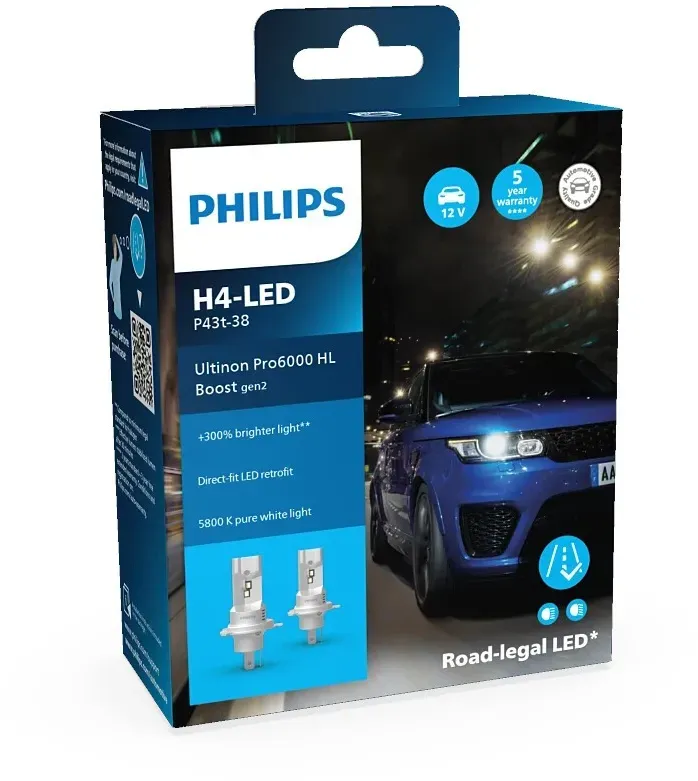 Kategorie: Autolampen - Philips - GTIN:8719018027924 - Wechseln Sie jetzt die Halogenlampen Ihrer Scheinwerfer mit den innovativen Philips LED-Nachrüstlampen der Ultinon Pro6000 Boost Serie und erleben Sie höchsten Fahrkomfort und bahnbrechende Helligkeit mit Straßenzulassung in Deutschland, österreich und vielen weiteren europäischen Ländern*. Prüfen Sie vor dem Kauf die aktuell zugelassene Modellübersicht und weitere rechtliche Hinweise auf philips.com/roadlegalled. Alle Informationen finden Sie auch unten im Bereich Produktleitfäden zum Download. Die einzigartige Direct-fit Architektur sorgt für einen reibungslosen Einbau mit bislang unerreichter Kompatibilität und Fahrzeugabdeckung. Die äußerst kompakten Abmessungen ermöglichen den 1:1 Tausch der Halogen Lampe ganz ohne größere Abdeckkappen. Ein schneller und reibungsloser Einbau ist damit auch für Heimanwender möglich. Die neuste Generation exklusiver Automotive LED-Chips aus der Erstausrüstung der Automobilhersteller verbessert Ihre Sicht und liefert bis zu 300% helleres Licht**. Die Philips SafeBeam Technologie sorgt für optimierte Lichtbeständigkeit und die optimale, blendungsfreie Lichtverteilung auf der Straße für Ihre bislang sicherste Fahrt. Mit einer optimalen Lichtfarbe von 5.800 Kelvin erzeugt die Philips Ultinon Pro6000 Boost LED ein besonders weißes, kontrastreiches Licht mit dem Sie Straßenschilder und Hindernisse deutlich früher erkennen können und das ein frühzeitiges Ermüden der Augen verhindert. Die ... Dieses Angebot ist eine gute Option für ein Paar H4-LED-Glühlampen mit 12V, die sowohl für Fern- als auch Hauptscheinwerfer geeignet sind. ![]() ![]() PHILIPS Ultinon Pro6000 HL Boost H4 LED Glühlampe, Fernscheinwerfer,Glühlampe, Hauptscheinwerfer,Glühlampe 12V 11342U60B2X2