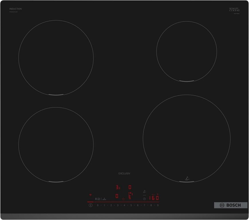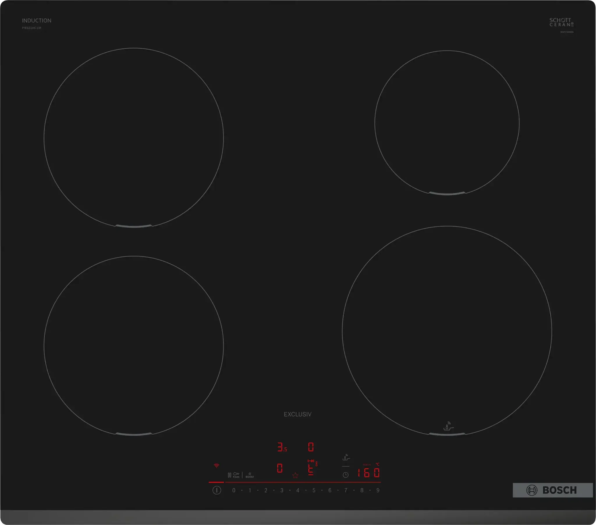 4 Händlerangebote bei billiger.de - Kategorie: Kochfelder - Bosch - Das Direct Select-Kochfeld mit PerfectFry Plus: Direkte und einfache Steuerung mit Temperatursensor, der ein Anbrennen verhindert. Bosch PIE631HC1M, Schwarz, Integriert, 60 cm, Zonen-Induktionskochfeld, Glaskeramik, 4 Zone(n) Bosch PIE631HC1M. Produktfarbe: Schwarz, Geräteplatzierung: Integriert, Größe der Kochfeldbreite: 60 cm. Steuerung: Berührung, Steuerungsposition: Vorderseite. Anschlusswert (elektrisch): 7400 W, AC Eingangsspannung: 220-240 V, AC Eingangsfrequenz: 50/60 Hz. Bedienung durch Apps unterstützt: Home Connect. Breite: 592 mm, Tiefe: 522 mm, Höhe: 51 mm PIE631HC1M Serie 6 Induktionskochfeld 60 cm Schwarz, Rahmenlos aufliegend - GTIN:4242005361496 ![]() ![]() Bosch Serie 6 PIE631HC1M autarkes 60 cm Induktions Kochfeld/Herdplatte 4 Zone(n) (inkl. Lieferung zum Aufstellungsort) jetzt zusätzlich 3x30 Gutschein von Eismann sichern!* & jetzt zusätzlich 50 Cashback sichern!*